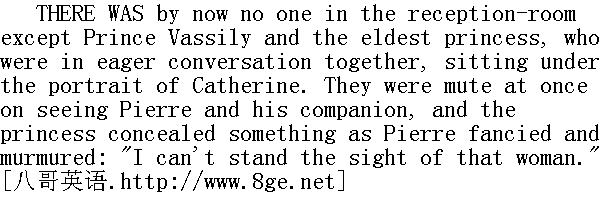 除开瓦西里公爵和公爵的大小姐而外, 接待室里没有其他人, 他们二人坐在叶卡捷琳娜画像下面, 正在兴致勃勃地谈论什么事。他们一望见皮埃尔和他的带路人, 就默不作声了。皮埃尔仿佛看见公爵的大小姐把一样东西藏起来, 并且轻言细语地说道: "我不能跟这个女人见面。" "Katish has had tea served in the little drawing-room," Prince Vassily said to Anna Mihalovna. "Go, my poor Anna Mihalovna, take something or you will not hold out." "Caticheafaitdonnerduthedanslepetitesalon, " 瓦西里公爵对安娜?米哈伊洛夫娜说道, "Allez, mapauvre安娜?米哈伊洛夫娜, prenezquequeclhose, autrementvousnesuffirezpas."③ ③法语: 卡季什已经吩咐人将茶端进小客厅去了。可怜的安娜?米哈伊洛夫娜, 您最好去提提精神, 否则您会没有力气的。 To Pierre he said nothing; he simply pressed his arm sympathetically. Pierre and Anna Mihalovna went on into the little drawing-room. 他对皮埃尔什么话也没有说, 只是亲切地握握他的手。皮埃尔和安娜?米哈伊洛夫娜向petitAalon④走去。 ④法语: 小客厅。