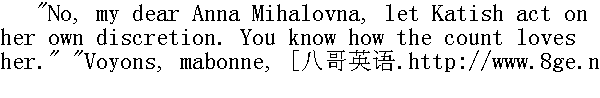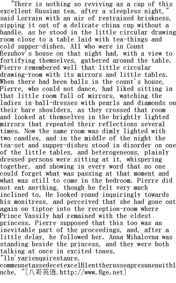 ①罗兰在圆形小客厅的桌子前面站着, 这张桌上放着茶具和晚餐的冷菜, 他端着很精致的不带把的中国茶碗, 一口一口地呷着茶, 流露着抑制兴奋的神色说道。这天晚上, 那些在别祖霍夫伯爵家里的人, 为了要提提精神, 都聚集在桌子周围。皮埃尔很清楚地记得这间嵌有几面镜子和摆放几张茶几的圆形小客厅。伯爵家里举行舞会时, 皮埃尔不会跳舞, 只喜欢坐在这间嵌有镜子的小客厅里, 从一旁观看那些穿着舞衣、裸露的肩上戴有钻石和珍珠项链的女士们穿过这间客厅时照照镜子的情景, 几面闪闪发亮的镜子一连几次反映出她们的身影。现在这个房间只点着两根光线暗淡的蜡烛, 在这深夜里, 一张小茶几上乱七八糟地放着茶具和盘子, 穿着得不太雅致的五颜六色的人们坐在这个房间里窃窃私语, 言语行动都表示谁也不会忘记现在发生的事情和可能发生的事情。皮埃尔没有去吃东西, 尽管他很想吃东西。他带着疑问的目光望望他的带路人, 看见她踮起脚尖又走到接待室, 瓦西里公爵和公爵的大小姐还呆在那里, 没有走出去。皮埃尔认为有必要这样行事, 他停了一会, 便跟在她后面去了。安娜?米哈伊洛夫娜站在公爵的大小姐近旁, 二人同时心情激动地轻声说话。 ①法语: 在不眠之夜以后, 再没有什么比一碗十分可口的俄国茶更能恢复精力的了。 "Allow me, madam, to know what is and what is not to be done," said the princess, who was apparently in the same exasperated temper as she had been when she slammed the door of her room. " 公爵夫人, 请您让我知道, 什么是需要的, 什么是不需要的。"公爵的大小姐说, 她那激动的心情显然跟她砰然一声关上房门时的心情一样。 "But, dear princess," Anna Mihalovna was saying mildly and persuasively, blocking up the way towards the bedroom and not letting the princess pass. "Would that not be too great a tax on poor uncle at such a moment, when he needs repose? At such moments to talk of worldly matters when his soul is already prepared ..."" 可是, 亲爱的公爵小姐, "安娜?米哈伊洛夫娜拦住通往寝室的路, 不让公爵小姐走过去, 她温和而恳切地说, "在可怜的叔叔需要休息的时刻, 这样做不会使他太难受么?在他已经有了精神准备的时刻, 竟然谈论世俗的事情......" Prince Vassily was sitting in a low chair in his habitual attitude, with one leg crossed high above the other. His cheeks were twitching violently, and when they relaxed, they looked heavier below; but he wore the air of a man little interested in the two ladies' discussion. 瓦西里公爵坐在安乐椅上, 一条腿高高地架在另一条腿上, 现出十分亲热的姿态。他的腮帮子深陷, 下部看起来更为肥厚, 跳动得很厉害, 但是他摆出一副不太关心两个女士谈论的样子。