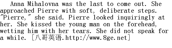 安娜?米哈伊洛夫娜最后一人走出来。她用徐缓的脚步走到皮埃尔面前。"皮埃尔!......"她说道。皮埃尔以疑问的目光望着她。她吻吻年轻人的前额, 眼泪把它沾湿了。她沉默了片刻。 "He is no more. ...""Iln'estplus..." ①①法语: 他不在世了。 Pierre gazed at her over his spectacles. 皮埃尔透过眼镜望着她。 "Come. I will take you back. Try to cry. Nothing relieves like tears." "Allons, jevousreconduiraiTachezdepleurer Riennesoulage, commeleslarmes."② She led him into the dark drawing-room, and Pierre was glad tha t no one could see his face. Anna Mihalovna left him, and when she came back he was fast asleep with his arm under his head. 她把他带到昏暗的客厅里, 皮埃尔心里很高兴的是, 那里没有人看见他的面孔。安娜?米哈伊洛夫娜从他身旁走开了。当她回来时, 他把一只手搁在脑底下酣睡了。 The next morning Anna Mihalovna said to Pierre: "Yes, my dear boy, it is a great loss for us all. I do not speak of you. But God will uphold you; you are young, and now you are at the head of an immense fortune, I hope. The will has not been opened yet. I know you well enough to know that this will not turn your head, but it will impose duties upon you and you must be a man." 翌日清晨, 安娜?米哈伊洛夫娜对皮埃尔说: "Oui, moncher, c'estunegrandepertepournoustous, Jeneparlepasdevous.Maisdieuvoussoutiendra, vousetesjeuneetvousvoilaalateted'uneimmensefortune, jel'espere, Letestanentn'apaseteencoreouvert, Jevousconnaisassezpoursavoirquecelanevoustounrnerapaslatete, maiscelavousim-posedesdevoirs, etilfautetre homme."① ①法语: 对, 我的朋友, 即使不提及您, 这对于我们所有的人也是极大的损失。但是上帝保佑您, 您很年轻, 我希望您如今是一大笔财产的拥有者。遗嘱还没有拆开来, 对于您的情形我相当熟悉, 坚信这不会使您冲昏头脑。但是这要您承担义务, 您要做个大丈夫。