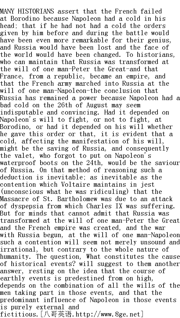 许多史学家说, 波罗底诺战役法国人没有打赢是因为拿破仑感冒了, 如果他没有感冒, 在战斗之前和在战斗期间他的作战命令一定更加有天才, 俄国人一定失败, et la face du monde eut ete changee①。一些史学家认为, 俄国的缔造是由于一个人的意志--彼得大帝的意志, 法国由共和变为帝制, 法国的军队开进俄国, 也是由于一个人的意志所为--拿破仑的意志, 俄国所以强盛, 是因为拿破仑在八月二十六日患了重感冒, 这些论断在一些史学家看来无疑是合乎逻辑的。 假如波罗底诺战役的发动与否取决于拿破仑的意志, 发出这个或那个命令也取决于他的意志, 那么, 显然能够影响他表现意志的伤风感冒可能是俄国得救的原因, 因此, 那个在二十四日忘记给拿破仑防水靴子的侍仆也是俄国的救星了。用这种思路得出的结论是无可怀疑的, 正如伏尔泰开玩笑(他自己也不知嘲笑什么)说, 巴托洛缪之夜①是由于查理九世肠胃失调引起的, 这个结论同样是无可怀疑的。但是有人不认为俄国的缔造只凭彼得大帝一个人的意志, 法兰西帝国的形成以及它同俄国的战争也不是由于拿破仑一个人的意志, 在这些人看来, 前面的有关结论不仅是不正确的, 不合理的, 而且与整个人类的现实生活相矛盾。关于形成历史事件的原因这个问题的另一答案是: 这世界事件的过程是上天注定的, 它取决于参加这些事件的人们的任意行动的巧合, 拿破仑之类的人物对事件过程的影响, 不过是表面的, 虚假的。 ①法语: 而世界的面貌也就会改变了。 ①巴托洛缪之夜指一五七二年八月二十四日的前夕, 巴黎天主教对于戈诺教徒的大屠杀。 Strange at first sight as appears the proposition that the Massacre of St. Bartholomew, the order for which was given by Charles IX., was not the result of his will, and that it was only in his fancy that the command he had given was the cause of it, and that the Borodino slaughter of eighty thousand men was not due to Napoleon's will (though he gave the order for the commencement of the battle), and that it was only his fancy that it was his doing, strange as this proposition appears, yet human dignity, that tells us that every one of us is neither more nor less a man than Napoleon, bids us admit that solution of the question, and historical researches abundantly confirm the proposition. 有一种看法乍一看来很奇怪, 那就是: 巴托洛缪之夜的屠杀事件, 虽然发命令的是查理九世, 但不是按照他的意志发生的, 他不过觉得是他命令这样做的;波罗底诺八万人的大屠杀事件也不是按照拿破仑的意志发生的(虽然开战及战斗中的命令都是他发出的), 他不过觉得命令是他发布的罢了, --不管这个看法多么奇怪, 但是, 人的尊严告诉我, 我们每一个人, 作为一个人来说, 纵然不比伟大的拿破仑强, 无论如何不会比他差多少, 人的尊严叫我们这样看问题, 历史的研究也充分肯定了这种看法。 At the battle of Borodino Napoleon did not fire at any one, nor kill any one. All that was done by his soldiers. Therefore it was not he who killed those men. The soldiers of the French army went out to slay their fellow-men at Borodino, not owing to Napoleon's commands, but through their own desire to do so. The whole army-French, Italians, Germans, Poles-hungry, ragged, and exhausted by the march, felt at the sight of an army, barring their way to Moscow: the wine is drawn, it must be drunk. Had Napoleon forbidden them at that point to fight the Russians, they would have killed him, and have proceeded to fight the Russians, because it was inevitable for them 在波罗底诺战役中, 拿破仑没有对任何人射击, 也没有杀一个人, 一切都是士兵做的。由此可见, 杀人的不是他。.法国士兵在波罗底诺战役中屠杀俄国士兵, 并不是由于拿破仑的命令, 而是出于自愿。全部军队: 法国人、意大利人、德国人、波兰人--他们饥肠辘辘、衣衫褴褛、在行军中累得精疲力尽, --看见阻碍他们去莫斯科的军队, 他们就感到, le vin est tire et qu'il faut le boire①。假若拿破仑当时禁止他们和俄国人打仗, 他们会把他杀死, 然后去打俄国人, 因为这是他们必需要做的。 When they heard Napoleon's proclamation, offering them as consolation for maiming and death the reminder that posterity would say that they had been at the battle before Moscow, they shouted, "Vive l'Empereur," just as they shouted "Vive l'Empereur" at the sight of the picture of the little boy playing cup and ball with the earth, and just as they shouted "Vive l'Empereur" at every absurdity that was said. There was nothing left for them to do but to shout "Vive l'Empereur!" and to fight so as to get food and rest as conquerors in Moscow. Therefore it was not owing to Napoleon's commands that they killed their fellow-men. 当他们听到拿破仑在命令中晓谕他们, 子孙后代会因为他们在莫斯科城下战斗过, 有过阵亡和受伤而得到慰藉, 他们就高呼: "Vive l'empereur!"②, 正像他们一看见小孩用小棒捅地球的画像, 就喊: "Vive l'empereur!"一样, 也正如他们不论听到什么毫无意义的话就高呼?"Vive l'empereur!"一样。他们除了高呼"Vive l'empereur!"和去打仗, 以便在莫斯科以征服者的身份得到食物和休息以外, 再没有什么事可做了。由此看来, 他们残杀自己的同类并非由于拿破仑的命令。 ②法语: 皇帝万岁。 And it was not Napoleon who ordained the course of the battle, because none of his instructions were put into execution, and he knew nothing of what was passing before him. Therefore the manner in which these men slaughtered one another did not depend on Napoleon's will, but proceede