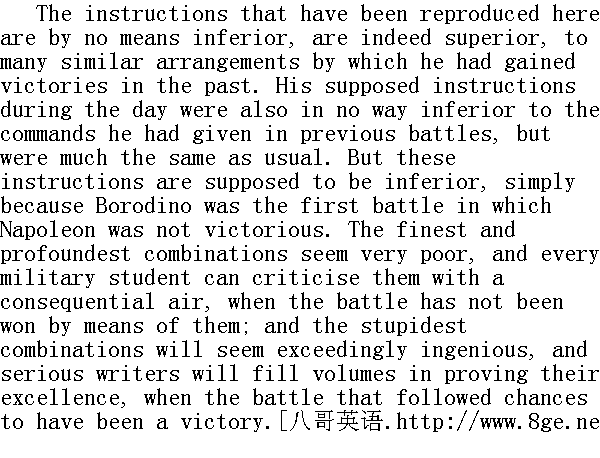 此处引述的战斗部署一点也不比先前他打胜仗的所有战斗部署更差, 甚至还要好些。那些在战斗中臆想的命令也并不比以前的更差, 完全和以前的一样。这些部署和命令之所以好像比以前差, 那不过是因为波罗底诺战役是拿破仑第一次败北罢了。不论多么优秀单绝、深思熟虑的部署和命令, 只要据此打了败仗, 就好像是非常糟的, 每一个军事科学家都煞有介事地批评它们, 不论多么糟的部署和命令, 只要据此打了胜仗, 就好像是非常好的, 那些严肃认真的学者都撰写卷帙浩繁的书籍论证它的优点。 The plan composed by Weierother at Austerlitz was a model of perfection in its own line, but it has yet been condemned, and condemned for its very perfection, for its over-minuteness in detail. 魏罗特尔拟定的奥斯特利茨战役的部署, 就是这类作品的完美典范, 但是人们仍然指摘它, 指摘它的完美, 指摘它过分的烦琐。 At Borodino Napoleon played his part as the representative of supreme power as well, or even better, than he had done at previous battles. He did nothing likely to hinder the progress of the battle; he yielded to the most sensible advice; he was not confused, did not contradict himself, did not lose his presence of mind, nor run away from the field of battle, but with his great tact and military experience, he performed calmly and with dignity his role of appearing to be in supreme control of it all. 拿破仑在波罗底诺战役中完成它作为权力代表者的任务并不比在其他战役中完成得差, 甚至更好些。他并没有作出妨碍战斗进行的事情;他倾听比较合理的意见;他没有手忙脚乱, 没有自相矛盾, 没有惊慌失措, 也没有从战场上逃跑, 而是施展了他那巨大的节制能力和作战经验, 镇静而庄严地扮演了他那貌似统帅的角色。