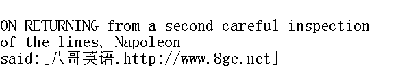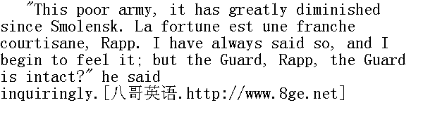 "Cette pauvre armee!"他突然说, "elle a bien diminueedepuis Smolensk.La fortune est une franche courtisane, Rapp, je le disais toujours, et je commence a l'eprouver.Mais la garde, Rapp, la garde est intacte?"②他疑惑地说。 ②法语: 可怜的军人!自从斯摩棱斯克战役以来, 大大地减少了。命运真是个放荡的女人, 拉普。我过去总是这么说, 现在开始体验到了。但是近卫军, 拉普, 近卫军还完整吧? "Yes, sire," replied Rapp. "Oui, Sire 。"③拉普回答。 Napoleon took a lozenge, put it in his mouth, and looked at his watch. He was not sleepy, and morning was still far off; and there were no instructions to be drawn up to get through the time, for all had been already given, and were even now being put into execution. 拿破仑拿起一片药放进嘴里, 看了看表。他不想睡了, 离天亮还早;用发命令来消磨时间已经不行了, 因为全部命令已经发出, 现在正在执行中。 "Have the biscuits and the rice been distributed to the regiments of the Guard?" Napoleon asked severely. "A-t-on distribue les biscuits et le riz aux regiments de la garde?"④拿破仑严厉地问。 ④法语: 面包和米都发给近卫军了吗?