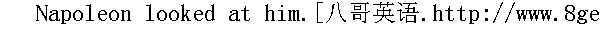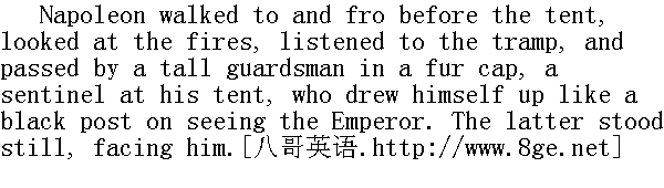 拿破仑在收篷前走了走, 看看火光, 细听一下脚步声, 他从一个高个子的卫兵面前走过, 这个戴着毛皮帽的卫兵在他的帐篷前站岗, 他一看见皇帝就把身子挺得像根黑柱子, 拿破仑在他面前站住了。 "Since what year have you served?" he asked, with that affectation of military bluntness and geniality with which he always addressed the soldiers. The soldier answered." 你是哪年入伍的?"他问。地对士兵说话时, 总是装腔作势, 爱用既粗鲁又和气的军人口吻, 那个士兵回答了他。 "Ah! one of the veterans! Have you all had rice in the regiment?" "Ah!un des vieux①你们团里领到米了吗?" ①法语: 啊!是一个老兵了!
