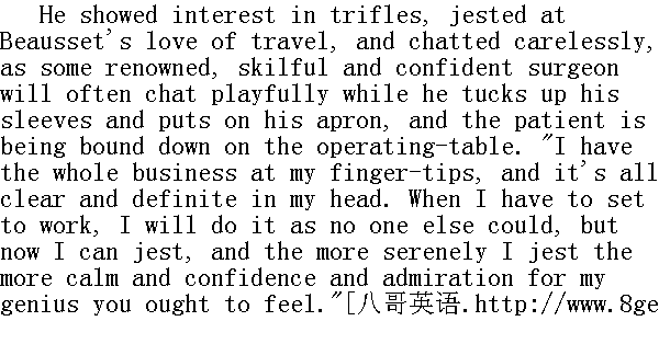 他关心琐事, 嘲笑德波塞爱旅行的癖好, 他随时闲谈, 那神气就像一个著名的、自信的、内行的外科医生, 他卷起袖子, 围上围裙, 病人被绑在手术床上: "事情全抓在我的手里和头脑里, 它是清楚的, 明确的。一着手干起来, 谁也比不了我, 现在我可以开开玩笑, 我愈是谈笑自若, 你们就愈有信心, 愈镇静, 也就愈惊奇于我的天之。" After emptying a second glass of punch, Napoleon went to seek repose before the grave business which, as he imagined, lay before him next day. 喝完第二杯潘趣酒, 拿破仑觉得明天有一桩严重的事情在等待着他, 就休息去了。 He was so preoccupied with what lay before him that he could not sleep, and in spite of his cold, which got worse with the damp of evening, he got up at three o'clock, and went out into the principal compartment of the tent, sneezing violently. He asked whether the Russians had not retreated. He was told that the enemy's fires were still in the same places. He nodded approval. 他对面临的事情太操心了, 以致无法入睡, 而夜里的潮湿更加重了他的感冒。凌晨三点钟, 他大声擤着鼻子, 走进帐篷的大房间。他问俄国人是否已经撤退, 人们回答说, 敌人的火光仍在原来的地方。他赞许地点了点头。 The adjutant on duty came into the tent. 值日副官走进帐篷。 "Well, Rapp, do you think we shall do good business to-day?" he said to him. ③法语: 喂, 拉普, 你看咱们今天能打胜吗? "Without doubt, sire!" answered Rapp. "Sans aucun doute, Sire."④拉普回答说。 ④法语: 毫无疑问, 陛下。