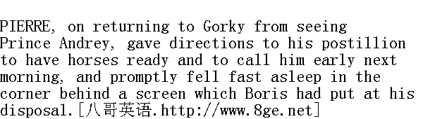 皮埃尔从安德烈公爵那儿回到戈尔基, 命令马夫把马备好, 明天一早叫醒他, 然后就在鲍里斯让给他的间壁的一个角落里睡着了。 When Pierre was fully awake next morning, there was no one in the hut. The panes were rattling in the little windows. The postillion was at his side, shaking him. "Your excellency, your excellency, your excellency ..." the groom kept saying persistently, shaking him by the shoulder, without even looking at him, apparently having lost all hope of ever waking him up. 第二天早晨, 当皮埃尔完全醒来时, 屋里已经没有人了。小窗户上的玻璃震动着。马夫站在床前推他。"大人, 大人, 大人, ......"马夫眼睛没看皮埃尔, 一个劲儿推他的肩膀, 一面推, 一面呼唤, 显然他已失去叫醒他的希望。 "Eh, has it begun? Is it time?" said Pierre, waking up." 什么?开始了吗?到时候啦?"皮埃尔醒来就问。 "Listen to the firing, your excellency," said the postillion, an old soldier; "all the gentlemen are gone already; his highness set off long ago."" 您听听咆声, "这个退伍兵--马夫说, "老爷们全出动了, 勋座也老早就过去了。" Pierre dressed in haste, and ran out into the porch. It was a bright, fresh, dewy, cheerful morning. The sun had just broken through the cloud that had screened it, and its rays filtered through the rent clouds, and over the roofs of the street opposite on to the dew-drenched dust of the road, on to the fences and the windows of the houses, and Pierre's horses standing by the cottage. The roar of the cannon could be heard more distinctly in the open air. An adjutant galloped down the street, followed by a Cossack. 皮埃尔连忙穿上衣服, 跑到门廊上。外面天气晴朗, 空气新鲜, 露珠儿闪着光, 令人愉快。太阳刚从乌云里蹦出来, 阳光被零零碎碎的乌云遮成两半, 越过对面街上的屋顶, 照射到布满露水的大路尘土上, 照射到房屋的墙上, 照射到围墙上的窗眼上和站在农舍旁的皮埃尔的马身上。外面的炮声听得更清楚了。一个副官带着一名哥萨克从街上急驰而过。
