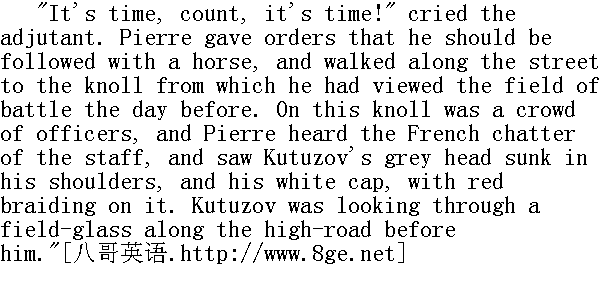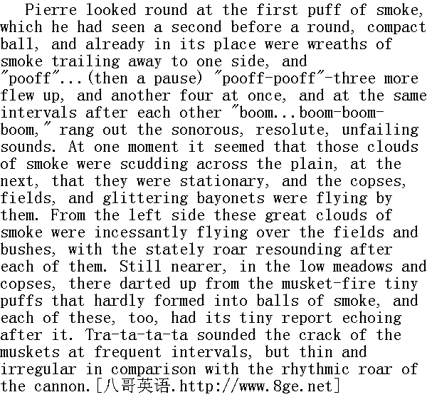 到时候了, 伯爵, 到时候了!"副官喊道。皮埃尔吩咐马夫牵着马跟他走。他沿着街步行到他昨天观看战场的那个土岗上。土岗上有一群军人, 可以听见参谋人员用法语谈话, 看见库图佐夫戴着红箍白帽的、白发苍苍的脑袋和他那缩进两肩之间的满是白发的后脑勺。库图佐夫用望远镜瞭望着前面的大路。 Mounting the steps of the approach to the mound, Pierre glanced before him, and felt a thrill of delight at the beauty of the spectacle. It was the same scene that he had admired from that mound the day before. But now the whole panorama was filled with troops and the smoke of the guns, and in the pure morning air the slanting rays of the sun, behind Pierre on the left, shed on it a brilliant light full of gold and pink tones, and broken up by long, dark shadows. The distant forests that bounded the scene lay in a crescent on the horizon, looking as though carved out of some precious yellow-green stone, and through their midst behind Valuev ran the great Smolensk road, all covered with troops. In the foreground lay golden fields and copses glittering in the sun. Everywhere, to right, to left, and in front were soldiers. The whole scene was inspiriting, impressive, and unexpected; but what struck Pierre most of all was the aspect of the field of battle itself, of Borodino, and the hollow on both sides of the Kolotcha. 皮埃尔沿着阶梯登上土岗, 他一看面前的美景, 就陶醉了。这仍然是他昨天在这山岗上欣赏到的景致;但是现在这一带地方硝烟弥漫, 满山遍野都是军队, 明亮的太阳从皮埃尔左后方升起, 在早晨洁净的空气中, 太阳把那金色、玫瑰色的斜晖和长长的黑影投射到地面上, 风景渐渐消失不见了, 远方的树林, 宛如一块雕刻的黄绿宝石, 在地平线上可以看见错落有致的黑色树巅, 斯摩棱斯克大道从树林中间即瓦卢耶瓦村的后面穿过, 大道上全是军队。金黄色的田野和小树林在近处闪闪发亮。前方、右方和左方, 到处都是军队。所有这一切都是那么生机勃勃, 庄严壮丽, 而且出乎意外;但是, 最让皮埃尔吃惊的是波罗底诺和科洛恰河两岸平川地带战场的景象。 About the Kolotcha, in Borodino, and both sides of it, especially to the left where the Voina runs through swampy ground into the Kolotcha, a mist still hung over the scene, melting, parting, shimmering with light in the bright sunshine, and giving fairy-like beauty to the shapes seen through it. The smoke of the guns mingled with this mist, and everywhere gleams of sunlight sparkled in it from the water, from the dew, from the bayonets of the soldiers crowding on the river banks and in Borodino. Through this mist could be seen a white church, here and there roofs of cottages in Borodino, and fitful glimpses came of compact masses of soldiers, and green ammunition-boxes and cannons. And the whole scene moved, or seemed to move, as the mist and smoke trailed over the wide plain. In this low ground about Borodino in the mist, and above it, and especially along the whole line to the left, in the copses, in the meadows below, and on the tops of the heights, clouds of smoke were incessantly springing out of nothing, now singly, now several at once, then at longer intervals, then in rapid succession. These clouds of smoke, puffing, rolling, melting into one another, and sundering apart, trailed all across the wide plain. These puffs of smoke, and the reports that followed them, were, strange to say, what gave the chief charm to the scene. 在科洛恰河上面, 在波罗底诺村及其两边, 特别是左边, 也就是沃伊纳河在沼泽地带入科洛恰河的地方, 弥漫着晨雾, 雾在融化, 消散, 在刚升起的明亮的太阳的照耀下变得透明起来, 雾中一切可以看见的景物神奇地变得五光十色, 只勾勒出那些东西的清晰的轮廓。枪炮的硝烟和雾混在一起, 在烟雾里, 到处闪烁着清晨的亮光--时而在水面上, 时而在露珠上, 时而在河西岸, 在波罗底诺聚集着的军队的刺刀上。透过烟雾可以看见白色的教堂, 波罗底诺农舍的屋顶, 密集的士兵, 绿色的子弹箱和大炮。所有这一切都仿佛在浮动, 或是好像在浮动, 因为在这一带整个空间都弥漫着烟和雾。在雾气腾腾的波罗底诺附近的洼地上, 以及在它以外的高地上, 特别是在战线的左方, 在树林、田野、洼地、高地的顶端, 仿佛无中生有似的不断地腾起大炮的团团浓烟, 有时单个出现, 有时成群出现;时而稀疏, 时而稠密, 这一带到处可以看见烟团膨胀开来, 茂盛起来, 汹涌滚动, 混成一片。说来奇怪, 这些硝烟和射击声, 竟构成了眼前景色的主体美。 "Poooff!" suddenly there flew up a round, compact ball of smoke, with shades of purple, grey, and milk-white in it, and "booom!" followed the roar of the cannon a minute later. 噗!--突然现出圆的、浓密的、淡紫的、灰色的、浮白色的烟, 砰!--过了一秒钟, 浓烟中传出一声巨响。 "Pooff-pooff!" two clouds of smoke rose, meeting and mingling into one; and "boom-boom," the sound repeated what the eye had seen." 噗-噗"--升起两团烟, 它们互相碰撞着, 混合着, "砰--砰"--两声炮响证实了眼前看见的东西。