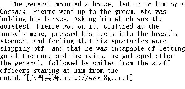 我也去, 我也去。"皮埃尔心里想, 就追随那个将军去了。那个将军跨上哥萨克给他带过来的马。皮埃尔走到给他牵马的马夫那儿。皮埃尔问过哪匹马比较驯良后, 就往一匹马身上爬, 他抓住马鬃, 脚尖朝外, 脚跟挤着马肚子, 他觉得眼镜就要掉下了, 但是他不能从马鬃和缰绳上腾出手来, 就跟着将军跑开了, 把站在山岗上看他的参谋人员都逗乐了。