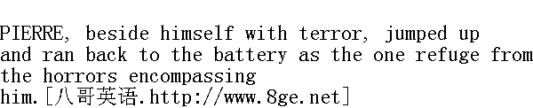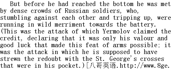 但是他还没来得及下去, 迎面就跑来一大群密密麻麻的俄国士兵, 他们呐喊着, 快活地, 拼命地、跌跌绊绊地往炮垒上跑。(这就是叶尔莫洛夫邀功的一次冲锋, 据他说, 多亏他的勇敢和幸运, 才发动那次冲锋, 为了激励士气, 据说在冲锋时, 他把衣袋里所有的圣乔治勋章都扔到土岗上让士兵去拿。) The French, who had captured the battery, fled. Our soldiers pursued them so far beyond the battery that they were with difficulty stopped. They were bringing the prisoners down from the battery, among them a wounded French general, surrounded by officers. Crowds of wounded, both French and Russians-among them men Pierre recognised-walked, or crawled, or were borne on stretchers from the battery, their faces distorted by suffering.Pierre went up into the battery, where he had spent over an hour; and found no one left of that little fraternal group that had accepted him as one of themselves. There were many dead there, whom he had not seen before. But several he recognised. The boy-officer was still sitting huddled up in a pool of blood at the edge of the earth wall. The red-faced, merry soldier was still twitching convulsively; but they did not carry him away. 一度占领炮垒的法国人逃跑了。我们的队伍喊着"乌拉"驱逐法国人, 追得远远地离开了炮垒, 没法叫住他们。从炮垒上带下来一群俘虏, 其中有一个负伤的将军, 军官们把他围起来。成群的伤员, 有皮埃尔认识的, 也有不认识的, 有俄国人, 也有法国人, 他们走着, 爬着, 用担架抬着, 从炮垒上下来, 他们的面孔由于痛苦都变了形。皮埃尔登上他刚才在那儿呆了一个多小时的土岗, 从那个他被接纳进去的家庭小圈子里, 已经找不到一个人了。这里有许多他不认识的死人。但他也认出了几个。那个青年军官仍旧弯着腰坐在土墙边一摊血泊里。那个红脸的士兵还在抽搐, 但没有人来抬他。 Pierre ran down the slope. 皮埃尔跑下了土岗。 "Oh, now they will stop it, now they will be horrified at what they have done!" thought Pierre, aimlessly following the crowds of stretchers moving off the battlefield." 不, 现在他们该住手了, 现在他们该为他们做过的事感到恐惧了!"皮埃尔想道漫无目的地朝着那撤离战场的成群的担架队走去。 But the sun still stood high behind the veil of smoke, and in front, and even more so to the left, about Semyonovskoye, there was still a turmoil seething in the smoke; and the roar of cannon and musketry, far from slackening, grew louder and more desperate, like a man putting all his force into one deafening outcry as a last despairing effort. 被浓烟遮着的太阳仍高高地照耀着, 在前面, 特别是在谢苗诺夫斯科耶村的左方, 有什么东西在烟雾里沸腾着, 隆隆的枪炮声、炮弹的爆炸声, 不但没有减弱, 反而加强了, 正像一个人竭尽全力地拼命叫喊一样。