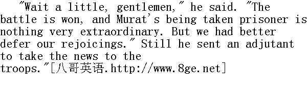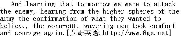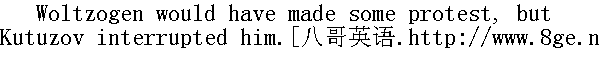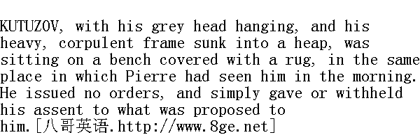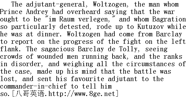 沃尔佐根想辩解, 但是库图佐夫打断他的话。 "The enemy has been repulsed on the left and defeated on the right flank. If you have seen amiss, sir, do not permit yourself to speak of what you do not understand. Kindly return to General Barclay and inform him of my unhesitating intention to attack the French to-morrow," said Kutuzov sternly." 左翼的敌人被打退了, 右翼也打败了。如果您没看清楚, 阁下, 就不要说您不知道的事。请您回去通知巴克莱, 我明天一定要向敌人进攻。"库图佐夫严厉地说, 大家都不吭声, 只听见老将军沉重的喘息声。 All were silent, and nothing was to be heard but the heavy breathing of the gasping, old general. "Repulsed at all points, for which I thank God and our brave men. The enemy is defeated, and to-morrow we will drive him out of the holy land of Russia!" said Kutuzov, crossing himself; and all at once he gave a sob from the rising tears." 敌人到处都被打退, 为这我要感谢上帝和我们勇敢的军队。战胜敌人, 明天把他们赶出俄国神圣的领土。"库图佐夫划着十字说, 忽然他老泪纵横, 声音哽咽了。 Woltzogen, shrugging his shoulders, and puckering his lips, walked away in silence, marvelling "uber diese Eingenommenheit des alten Herrn." 沃尔佐根耸耸肩, 撇撇嘴, 一声不响地走到一旁, uber diese Einge-nommenheit des alten Herrn②感到惊奇。 "Ah, here he is, my hero!" said Kutuzov, as a stoutish, handsome, black-haired general came up the hillside. It was Raevsky, who had spent the whole day at the most important part of the battlefield." 啊, 这不是他来了, 我的英雄。"这时一个身材魁伟、仪表英俊的黑发将军登上土岗, 库图佐夫看着他说。这个将军是拉耶夫斯基, 他整天都在波罗底诺战场的主要据点度过。 Raevsky reported that the men were standing their ground firmly, and that the French were not venturing a further attack. 拉耶夫斯基报告说, 我军紧守阵地, 法国人不敢再进攻了。 When he had heard him out, Kutuzov said in French: "You do not think, like some others, that we are obliged to retreat?""On the contrary, your highness, in indecisive actions it is always the most obstinate who remains victorious," answered Raevsky; "and my opinion..." 听了他的报告, 库图佐夫用法语说: "Vous ne pensez donc pas comme les autres que nous sommes obliges nous ritirer?"①"Au contraire, votre altesse, dans les attaires indecises c'est toujours le plus opiniaAtre qui reste victorieux, "拉耶夫斯基回答说, "Et mon opinion......"② ①法语: 这么说来, 您不像别人那样认为我们应当撤退了? "Kaisarov," Kutuzov called to his adjutant, "sit down and write the order for to-morrow. And you," he turned to another, "ride along the line and announce that to-morrow we attack."" 凯萨罗夫!"库图佐夫叫他的副官。"坐下写明天的命令。还有你, "他对另一个副官说, "到前线去宣传, 明天我们要进攻。" While he was talking to Raevsky and dictating the order, Woltzogen came back from Barclay and announced that General Barclay de Tolly would be glad to have a written confirmation of the order given by the field-marshal. 在库图佐夫同拉耶夫斯基谈话并口授命令的时候, 沃尔佐根从巴克莱那儿回来了, 他报告说, 巴克莱·德·托利将军希望能拿到元帅发出的那份命令的明文。 Kutuzov, without looking at Woltzogen, ordered an adjutant to make out this written order, which the former commander-in-chief very prudently wished to have to screen himself from all responsibility. And through the undefinable, mysterious link that maintains through a whole army the same temper, called the spirit of the army, and constituting the chief sinew of war, Kutuzov's words, his order for the battle next day, were transmitted instantaneously from one end of the army to the other. 库图佐夫不看沃尔佐根, 叫人写那份命令, 前总司令所以要书面命令, 一定是为了逃避个人的责任。有一种不可捉摸的神秘的链条, 它使全军同心同德, 并构成战争的主要神经, 这就是被称为士气的东西, 库图佐夫的话和他所下的第二天进攻的命令, 就是沿着这条链子传遍全军每个角落的。 The words and the phrases of the order were by no means the same when they reached the furthest links in the chain. There was, indeed, not a word in the stories men were repeating to one another from one end of the army to the other, that resembled what Kutuzov had actually said; but the drift of his words spread everywhere, because what Kutuzov had said was not the result of shrewd considerations, but the outflow of a feeling that lay deep in the heart of the commander-in-chief, and deep in the heart of every Russian. 传到这条链子的最后一环时, 已经远非原来的话及命令了。在军队各个角落互相传说的故事, 甚至与库图佐夫说的话完全不同;但是他的话的含意却传到了各处, 因为库图佐夫所说的话并非出于狡诈的计谋, 而是表达了总司令和每个俄国人心灵中的感情。
