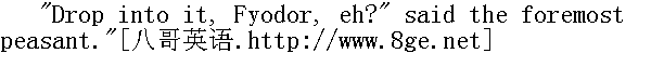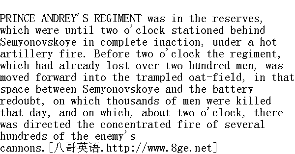 安德烈公爵的团留在后备队, 直到下午一点钟, 后备队仍然在猛烈的炮火下驻守在谢苗诺夫斯科耶村后面, 没有行动。一点多钟时, 在损失二百多人的情况下, 这个团才向前移到谢苗诺夫斯科耶村和土岗炮垒之间的一片踩平了的燕麦地里, 那一天土岗炮垒里伤亡了好几千人, 下午一点多钟, 敌人的几百门大炮集中火力对它猛轰。 Not leaving that spot, nor discharging a single round of ammunition, the regiment lost here another third of its men. In front, and especially on the right side, the cannons kept booming in the smoke that never lifted, and from the mysterious region of the smoke that hid all the country in front, there came flying swiftly hissing cannon balls and slowly whizzing grenades. Sometimes, as though to give them a breathing space, for a whole quarter of an hour all the cannon balls and grenades flew over them, but at other times, in the course of a single minute, several men out of the regiment would be swept off, and they were busy the whole time dragging away the dead and carrying off the wounded. 这个团在这儿没动, 也没放一枪, 又损失了三分之一的人。从前方, 特别是从右方, 在停滞不散的硝烟里, 大炮隆隆地发射着, 前面那一带神秘的区域的整个地面都弥漫着烟雾, 从那里不断飞出疾速的咝咝作响的炮弹和缓慢的呼啸而过的榴弹。有时, 好像要让人们休息一下, 一连一刻钟炮弹和榴弹都从上空中飞过去了, 可是有时, 一分钟工夫团里就损失好几个人。阵亡的不断被拖走, 受伤的则被抬走了。 With every fresh stroke the chances of life grew less and less for those who were not yet killed. The regiment was divided into battalions three hundred paces apart; but in spite of that, all the regiment was under the influence of the same mood. All the men of the regiment were alike gloomy and silent. At rare intervals there was the sound of talk in the ranks, but that sound was hushed every time the falling thud and the cry of "stretchers!" was heard. For the greater part of the time, by command of the officers, the men sat on the ground. One, taking off his shako, carefully loosened and then drew up the folds of it; another, crumbling the dry clay in his hands, rubbed up his bayonet with it; another shifted and fastened the buckle of his shoulder straps; while another carefully undid, and did up again, his leg bandages, and changed his boots. Some built little houses of clods of the ploughed field, or plaited straws of stubble. All of them appeared entirely engrossed in these pursuits. When men were killed or wounded, when the stretchers trailed by, when our troops retreated, when immense masses of the enemy came into view through the smoke, no one took any notice of these circumstances. When our artillery or cavalry advanced, when our infantry could be seen moving, approving observations could be heard on all sides. But quite extraneous incidents that had nothing to do with the battle were what attracted most notice; as though the attention of these morally overstrained men found a rest in the commonplace incidents of everyday life. Some batteries of artillery passed in front of their line. In one of the ammunition carriages a horse had put its legs through the traces. 随着每次新的攻击的来临, 还没有被打死的人的生存机会越来越少了。团以三百步距离排成纵队营, 虽然这样, 全团仍笼罩在同一情绪下。全团人一律沉默不语, 面色阴郁。队伍里很少有谈话声, 即使有人谈话, 一听见中弹声和喊"担架!"声, 也就停下了。大部分时间, 全团人遵照长官的命令坐在地上。有的摘下帽子, 专心地把褶子抻平, 然后再折起来;有的抓一把干土, 在手心里搓碎, 用它来擦刺刀;有的揉一揉皮带, 把带扣勒紧;有的把包脚布仔细抻平, 然后重新把脚包好, 穿上靴子。有些人用犁过的地里的土块搭小屋, 或者用麦秸编东西。大家都好像全神贯注在这些事情上。当打伤或打死了人的时候, 当成队的担架走过的时候, 当我们的队伍撤退的时候, 当大批敌人在烟雾中出现的时候, 谁也不去注意这些情况。可是当我们的炮兵、骑兵向前面走过去时, 当我们的步兵向前移动时, 赞许的声音却从四面八方响起。但是, 最能引起注意的是那些与战斗完全无关, 完全不相干的事。好像这些精神上受折磨的人把注意力放在这些平凡的、日常生活中的事物上, 就可以得到休息似的。一个炮兵连从团的正面走过, 一辆炮兵弹药车拉边套的马迈出了套索。 "Hey! look at the trace-horse!... Take her leg out! She'll fall!... Hey! they don't see!..." Shouts rose from the ranks all through the regiment." 嘿, 瞧那匹拉边套的马!......把腿伸进去!它要跌倒了......哎呀, 他们没看见!......".全团都在喊叫。 Another time the attention of all was attracted by a little brown dog, with its tail in the air, who had come no one knew from where, and was running about fussily in front of the ranks. All at once a cannon ball fell near it, and it squealed and dashed away with its tail between its legs! Roars and shrieks of laughter rang out from the whole regiment. But distractions of this kind did not last more than a minute, and the men had been eight hours without food or occupation, with the terror of death never relaxing for an instant, and their pale and haggard faces grew paler and more haggard 又有一次, 所有的人都注意到了不知从哪儿冒出来的一只褐色的小狗, 它把尾巴翘得高高的, 满怀心事地迈着小碎步, 跑到队伍前面, 忽然, 附近落下一颗炮弹, 它尖叫一声, 夹起尾巴, 跳到一边去了。全团的人哄然大笑, 发出尖叫声。但这种开心的事只延续了几分钟, 人们在不断的死亡恐怖中不吃不喝地