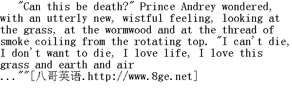 难道这就是死吗?"安德烈公爵一面想, 一面用完全新的、羡慕的眼光看青草、苦艾, 看那从旋转着的黑球冒出的一缕袅袅上升的青烟。"我不能死, 不愿死, 我爱生活, 爱这青草, 爱大地, 爱天空......" He thought this, and yet at the same time he did not forget that people were looking at him. 他这样想着, 同时想到人们都在望着他。 "For shame, M. l'aide-de-camp!" he said to the adjutant; "what sort of ..." He did not finish. Simultaneously there was a tearing, crashing sound, like the smash of broken crockery, a puff of stifling fumes, and Prince Andrey was sent spinning over, and flinging up one arm, fell on his face." 可耻呀, 副官先生!"他对副官说。"多么......"他没能把话说完。就在这一刹那, 发出了爆炸声, 像打破了玻璃窗似的碎片四面飞射, 闻得到令人窒息的火药味, 安德烈公爵向一旁猛然一冲, 举起一只手, 胸脯朝下摔倒了。 Several officers ran up to him. A great stain of blood was spreading over the grass from the right side of his stomach. 几个军官向他跑过来。血从右侧腹部流出来, 在草地上流了一大团血。 The militiamen stood with the stretchers behind the officers. Prince Andrey lay on his chest, with his face sunk in the grass; he was still breathing in hard, hoarse gasps. 叫来抬担架的后备军人在军官们身后站着。安德烈公爵俯卧着, 脸埋在草里, 发出沉重的呼呼噜噜的喘气声。