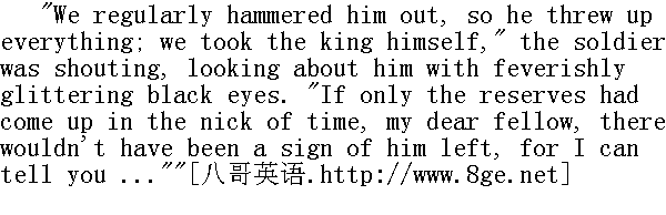 我们把他狠狠揍了一顿, 揍得他丢盔弃甲, 屁滚尿流, 连那个国王也给抓住了!"那个军士一双火热的黑眼睛闪着光, 环顾四周, 喊道。"后备军要是及时赶到, 弟兄们, 准把他全给报销, 我敢向你担保......" Prince Andrey, like all the men standing round the speaker, gazed at him with bright eyes, and felt a sense of comfort. "But isn't it all the same now?" he thought. "What will be there, and what has been here? why was I so sorry to part with life? There was something in this life that I didn't understand, and don't understand." 安德烈公爵也像讲话者周围的人一样, 用闪光的眼睛望着他, 感到了欣慰。"不过, 现在不是一切都无所谓了吗?"他想。"来世会是怎样?今世曾是怎样的?我过去为什么那样留恋生命?在这生命中有一种我过去和现在都不明了的东西。"