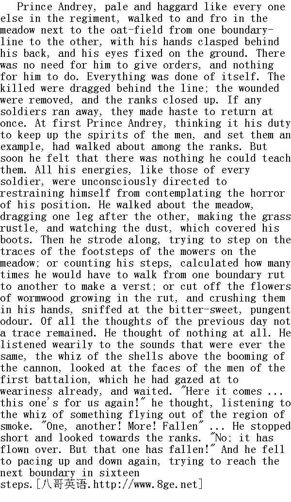 安德烈公爵也像团里所有的人一样, 面色苍白而阴郁, 他背着手, 低着头, 在燕麦地旁的草地里一个田垄一个田垄地走来走去。他无事可做, 也无命令可发。一切都听其自然。阵亡的人被拖到战线外面, 受伤的人被抬走, 队伍靠拢起来。如果有士兵跑开, 他们立刻就赶回来, 起初, 安德烈公爵认为鼓舞士气, 给士兵作一个榜样是他的责任, 所以在队伍里走来走去;但是, 后来他认识到, 他无须教他们, 也没有什么可教他们的。他和每个士兵一样, 全部的心力都在努力避免想象他们处境的危险。他在草地上来回走动, 慢慢地拖着两只脚, 蹭得地上的草沙沙作响, 眼睛盯着靴子上的尘土;他有时迈着大步, 尽可能踩上割草人留下的脚印, 有时数自己的脚步, 计算走一俄里要经过多少两条田垄之间的距离;有时采几朵长在田垄上的苦艾花, 放在手掌上揉碎, 然后闻那股强烈的甘苦香味。昨天所想的东西一点也没有了。他什么也不想。他用疲倦的听觉细听那总是同样的声音, 分辨枪弹的尖啸声和炮弹的轰隆声, 看第一营的士兵那些已经看厌了的脸, 他在等待着。"它来了......这一个又是冲我们来的!"他谛听着从硝烟弥漫的地带发出的越来越近的呼啸声, 心里想道。"一个, 两个!又一个!打中了......"他停下看了看队伍。"不是, 飞过去了。不过这个打中了。"他又开始走来走去, 极力迈大步, 要用十六步走到另一条田垄。 A whiz and a thud! Five paces from him the dry soil was thrown up, as a cannon ball sank into the earth. A chill ran down his back. He looked at the ranks. Probably a number had been struck: the men had gathered in a crowd in the second battalion. 呼啸声和撞击声!离他五步远的地方, 一颗炮弹炸开了干土, 然后就消失了。他不由地感到一阵寒冷掠过他的脊背。他又看了看队伍。大概又有许多伤亡: 在第二营聚集着一大群人。 "M. l'aide-de-camp," he shouted, "tell the men not to crowd together."The adjutant, having obeyed this instruction, was approaching Prince Andrey. From the other side the major in command of the battalion came riding up." 副官先生, "他喊道, "命令他们不要聚集在一起。"副官执行了命令, 然后是走到安德烈公爵面前。一个营长从另一方向驰来。 "Look out!" rang out a frightened cry from a soldier, and like a bird, with swift, whirring wings alighting on the earth, a grenade dropped with a dull thud a couple of paces from Prince Andrey, near the major's horse. The horse, with no question of whether it were right or wrong to show fear, snorted, reared, almost throwing the major, and galloped away. The horse's terror infected the men." 当心!"可以听见一个士兵惊慌的喊声, 一颗带着呼啸声疾飞的榴弹, 有如一只向地面俯冲下来的鸟, 落在离安德烈公爵两步远的营长的战马旁边, 发出砰的一声。那匹马不管露出恐怖的样子好不好, 先打了个响鼻, 竖起前蹄, 险些儿把那个少校掀下来, 然后向一旁跑开了。马的恐惧感染了人们。 "Lie down!" shouted the adjutant, throwing himself on the ground. Prince Andrey stood in uncertainty. The shell was smoking and rotating like a top between him and the recumbent adjutant, near a bush of wormwood in the rut between the meadow and the field." 卧倒!"扑倒在地的副官喊道。安德烈公爵站在那儿犹豫不决。一颗榴弹在他和副官之间, 在耕地和草地边上, 在一丛苦艾旁边, 像陀螺一般冒着烟旋转。