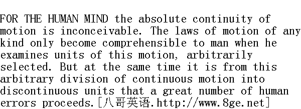 人类的智慧理解不了运动的绝对连续性。人类只有在审视随意抽取的任一运动的细分单元时, 方可逐步理解该运动的规律。但随即由于随意划分连续性的运动为间断性的单元, 从而产生出人类的大部分迷误。 We all know the so-called sophism of the ancients, proving that Achilles would never overtake the tortoise, though Achilles walked ten times as fast as the tortoise. As soon as Achilles passes over the space separating him from the tortoise, the tortoise advances one-tenth of that space: Achilles passes over that tenth, but the tortoise has advanced a hundredth, and so on to infinity. This problem seemed to the ancients insoluble. The irrationality of the conclusion (that Achilles will never overtake the tortoise) arises from the arbitrary assumption of disconnected units of motion, when the motion both of Achilles and the tortoise was continuous. 尽人皆知一条古代的辩术, 讲的是阿奇里斯①总赶不上他前面的乌龟, 尽管他走得比乌龟快十倍;因为每当他走完他与乌龟之间的距离时, 乌龟又超前爬了这段距离的十分之一了;阿奇里斯走过这十分之一, 乌龟则又超前爬了百分之一了, 以此类推, 直到无休无止。这道算式是一道古老的难以解决的算题。答案之荒谬(即阿奇里斯永远赶不上乌龟), 仅仅是由于轻率地假定运动的不连贯单元的存在, 而无论阿奇里斯或乌龟的运动, 都是连续进行的。 ①阿奇里斯是荷马《伊利亚特》中的英雄。 By taking smaller and smaller units of motion we merely approach the solution of the problem, but we never attain it. It is only by assuming an infinitely small magnitude, and a progression rising from it up to a tenth, and taking the sum of that geometrical progression, that we can arrive at the solution of the problem. A new branch of mathematics, dealing with infinitely small quantities, gives now in other more complex problems of dynamics solutions of problems that seemed insoluble. 把运动的单元愈分愈细, 我们只能接近问题的答案, 却永远得不出答案。只有假设出无穷小数和由无穷小数产生的十分之一以下的级数, 再求出这一几何级数的总量, 我们才能得出问题的答案。数学的一个新的分支在解决了处理无穷小数的技术后, 现已能在其他更为复杂的运动问题上求得对以前似乎解决不了的那些问题的答案。 This new branch of mathematics, unknown to the ancients, by assuming infinitely small quantities, that is, such as secure the chief condition of motion (absolute continuity), corrects the inevitable error which the human intellect cannot but make, when it considers disconnected units of motion instead of continuous motion. 古代人所不明了的这一新的数学分支, 在研究运动问题时, 因假设出无穷小数, 使运动的主要条件(绝对连续性)得以复原, 从而纠正人类的智慧以个别的运动单元代替对连续运动进行研究时不能不犯的错误。
