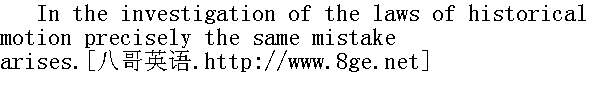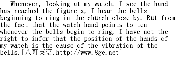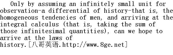 每当我看看钟, 看到钟的指针走到十, 便会听见邻近的教堂敲起钟声, 但是, 从指针走到十点祈祷钟声便敲响这一点出发, 我无权下结论说, 指针的位置是教堂的钟运动的原因。 Whenever I see a steam-engine move, I hear the whistle, I see the valve open and the wheels turn; but I have no right to conclude from that that the whistle and the turning of the wheels are the causes of the steam-engine's moving. 每当我看到火车头起动, 便听到汽笛声, 看到阀门打开, 车轮转动;但我无权由此得出结论: 汽笛声和车轮转动是机车运动的实质原因。 The peasants say that in the late spring a cold wind blows because the oak-buds are opening, and, as a fact, a cold wind does blow every spring when the oak is coming out. But though the cause of a cold wind's blowing just when the oaks are coming out is unknown to me, I cannot agree with the peasants that the cause of the cold wind is the opening of the oak-buds, because the force of the wind is altogether outside the influence of the buds. I see in this simply such a coincidence of events as is common in every phenomenon of life, and I see that however long and minutely I might examine the watch hand, the valve, and the wheel of the steam-engine and the oak-bud, I shall not discover the cause of the bells ringing, of the steam-engine moving, and of the spring wind. To do that I must completely change my point of observation and study the laws of the motion of steam, of the bells, and of the wind. History must do the same. And efforts have already been made in this direction. 农民说, 暮春刮寒风, 是因为橡树的芽苞绽开了, 而事实上, 每年春天当橡树抽芽时, 都刮冷风。但是, 虽然我不知道橡树抽芽时刮冷风的原因, 我亦不同意农民的看法, 认为橡树抽芽是刮冷风的原因, 因为芽苞影响不到风力。我只看到日常生命现象中一些条件的偶合, 我清楚, 无论我多么仔细地观察时钟的指针, 机车的阀门和车轮及橡树芽, 我依然不会明白祈祷钟声, 机车运动和倒春寒的原因。要明白其究竟, 我必须完全改变观察点, 去研究蒸汽、教堂大钟及风力的运动规律。史学也应如此。而且有人做了这方面的尝试。 For the investigation of the laws of history, we must completely change the subject of observations, must let kings and ministers and generals alone, and study the homogeneous, infinitesimal elements by which masses are led. No one can say how far it has been given to man to advance in that direction in understanding of the laws of history. But it is obvious that only in that direction lies any possibility of discovering historical laws; and that the human intellect has hitherto not devoted to that method of research one millionth part of the energy that historians have put into the description of the doings of various kings, ministers, and generals, and the exposition of their own views on those doings. 为了研究历史规律, 我们应该完全改变观察目标, 敞开帝王大臣将军们, 转而研究民众所遵循的同一类型的无穷小的因素。谁也无法说出, 用这一方法, 人类能获得对历史规律的几许了解;但是显而易见, 这条途径有获取历史规律的机会;且这条途径使人类智慧付出的努力, 还不及史学家用来描述帝王将相的行动, 和据此行动发挥其想象所费精力的百万分之一。