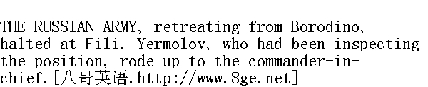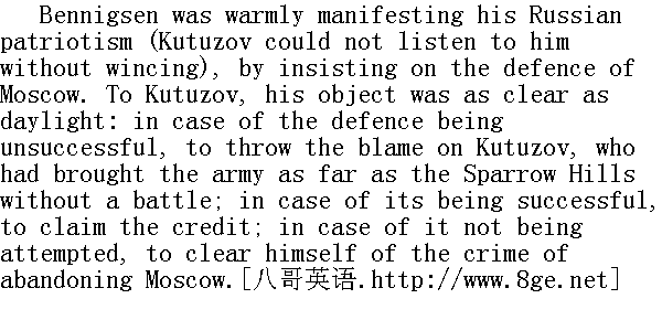 选好阵地的贝尼格森, 热烈地表现了一番爱俄国的爱国精神(对此, 库图佐夫只得皱眉头)之后, 坚持保卫莫斯科。库图佐夫明白如昼地看到了他的目的: 如果保卫战失败--把过失推给库图佐夫, 是他不战而回师麻雀山, 但假如成功呢--则记在自己帐上, 要是不采纳建议么--则可为自己开脱放弃莫斯科的罪责。 But these questions of intrigue did not occupy the old man's mind now. One terrible question absorbed him. And to that question he heard no reply from any one. The question for him now was this: "Can it be that I have let Napoleon get to Moscow, and when did I do it? When did it happen? Was it yesterday, when I sent word to Platov to retreat, or the evening before when I had a nap and bade Bennigsen give instructions? Or earlier still? ... When, when was it this fearful thing happened? Moscow must be abandoned. The army must retire, and I must give the order for it." 但这一阴谋现在已不能使老人有所触动。一个可怕的问题抓住了他, 怎样解开它的答案, 他还未听到过谁说出来。这个问题现在仅仅是: "难道放拿破仑到莫斯科的是我吗, 是我什么时候放他进来的?这是什么时候决定的?难道是昨天当我向普拉托夫下令撤退的时候, 或是前天晚上我要打个盹、命令贝尼格森处理军务的时候?或者还要早些吗?......但是在什么时候, 究竟是在什么时候决定这件可怕的事呢?莫斯科该放弃, 军队该后撤, 所以必须这样下令。" To give that terrible order seemed to him equivalent to resigning the command of the army. And apart from the fact that he loved power, and was used to it (the honours paid to Prince Prozorovsky, under whom he had been serving in Turkey, galled him), he was convinced that he was destined to deliver Russia, and had only for that cause been chosen commander-in-chief contrary to the Tsar's wishes by the will of the people. He was persuaded that in these difficult circumstances he was the one man who could maintain his position at the head of the army, that he was the only man in the world capable of meeting Napoleon as an antagonist without panic. And he was in terror at the idea of having to resign the command. But he must decide on some step, he must cut short this chatter round him, which was beginning to assume too free a character. 下达这道可怕的命令, 好像与拒绝就任总司令是一回事。可是不一样, 他爱掌权, 也习惯于掌权(驻扎于土耳其时, 作为僚属, 他对普罗佐罗夫斯基公爵受到的尊敬艳羡不置);他相信他肩负拯救俄罗斯的使命, 谨此之故, 才违背皇上的旨意, 顺从民心, 他被遴选为总司令一职。他相信, 唯独他一人能在此危难之际充当元戎之任, 全世界也唯有他一人能无所畏惧, 承认不败之拿破仑为己之敌手;但是, 一想到他必须下达的那一道命令, 便不寒而栗。应该决定些事情呢, 应该制止他周围越来越漫无边际的谈话了。 He beckoned the senior generals to him. 他召拢几个为首的将军。 "Ma tete, f?t-elle bonne ou mauvaise, n'a qu'a s'aider d'elle-meme," he said, getting up from his bench, and he rode off to Fili, where his carriages were waiting. ①法语: 我的脑袋不管是好是坏, 也只有依靠它了。