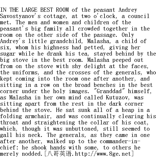 两点正, 在农民安德烈·萨沃斯季雅诺夫一间宽敞、也是最好的房间里召集了会议。这一庞大农户的男人、妇女和小孩, 统统挤到隔着过厅的那间没有烟囱的农舍里。只有安德烈的一个孙女玛拉莎, 才六岁的小姑娘, 呆在这个大房间的壁灶上, 勋座抚爱她, 吃茶时赏给她一块方糖。玛拉莎怯生地欢喜地从壁灶上瞧着将军们的面孔, 制服和十字勋章, 他们相继进屋, 对直走向客位, 在圣像下的宽凳上落座。老爷爷, 玛拉莎心里这样称呼的库图佐夫, 有意避开众人坐在壁灶后边不见亮光的角落里。他埋在折叠扶手椅里, 不停地咳呛着清嗓子, 不断拉抻礼服的衣领, 虽然衣领是敞开的, 仿佛仍卡着脖子。来人相继走到陆军元帅身旁, 有的握手, 有的鞠躬。 The adjutant, Kaisarov, would have drawn back a curtain from the window facing Kutuzov, but the latter shook his hand angrily at him, and Kaisarov saw that his highness did not care for them to see his face. 副官凯萨罗夫想要拉开库图佐夫对面的窗帘, 但是库图佐夫生气地朝他摆手, 于是凯萨罗夫明白, 勋座不愿让人看见他的脸。 Round the peasant's deal table, on which lay maps, plans, pencils, and papers, there was such a crowd that the orderlies brought in another bench, and set it near the table. Yermolov, Kaisarov, and Toll seated themselves on this bench. In the foremost place, under the holy images, sat Barclay de Tolly, with his Order of St. George on his neck, with his pale, sickly face and high forehead that met his bald head. He had been in the throes of fever for the last two days, and was shivering and shaking now. Beside him sat Uvarov, speaking to him with rapid gesticulations in the same low voice in which everybody spoke. Little chubby Dohturov was listening attentively with his eyebrows raised and his hands clasped over his stomach. On the other side, resting his broad head on his hand, sat Count Osterman-Tolstoy, with his bold features and brilliant eyes, apparently plunged in his own thoughts. Raevsky sat twisting his black curls on his temples, as he always did, and looking with impatience from Kutuzov to the door. Konovnitsyn's firm, handsome, good-humoured face was bright with a sly and kindly smile. He caught Malasha's eye, and made signs to her with his eyes, that set the little girl smiling. 农家的杉木桌上摆着地图、计划、铅笔, 纸张, 桌旁的人多得坐不下, 勤务兵只得又抬来一张长凳放在桌边。在这条凳子上就座的是刚来的叶尔莫洛夫, 凯萨罗夫和托尔。在圣像下边的首位上坐着挂圣乔治十字勋章的巴克莱-德-托利, 他一副苍白的病容, 高高的额头与秃项连成了一片。他患疟疾已有两天, 此时正在发冷, 快散架了。和他并排坐的是乌瓦罗夫, 他低声地(大家说话都这样)告诉巴克莱什么事情, 手势动作极快。矮胖的多赫图罗夫眉毛高挑, 双手叠放在肚皮上, 凝神谛听着。另一边坐的是奥斯特曼-托尔斯泰伯爵, 他把棱角英武双目有神的头颅托在宽大的手掌上, 流露出一副沉思的样子。拉耶夫斯基不耐烦地像往常一样裹他的黑发卷儿, 时而默瞅库图佐夫, 时而瞧瞧进出的门。科诺夫尼岑刚毅优美、和善的脸上, 闪烁着温和狡黠的微笑。他碰到玛拉莎的目光, 对她挤挤眼, 使小姑娘乐了。 They were all waiting for Bennigsen, who, on the pretext of a fresh inspection of the position, was engaged in finishing his luxurious dinner. They waited for him from four to six o'clock, and all that time did not enter on their deliberations, but talked of extraneous matters in subdued tones. 大家在等贝尼格森, 他藉口再次视察阵地, 而其实还在享用美味的午餐。大家从四点等到六点, 整个这段时间里没有正式开会, 只是轻言细语谈题外的话。 Only when Bennigsen had entered the hut, Kutuzov moved out of his corner and came up to the table, but sat there so that his face did not come within the light of the candles on it. 库图佐夫在贝尼格森进屋时, 方才从角落里起身, 移近桌子, 但只稍许移动, 让桌上的烛光照不到他的脸。