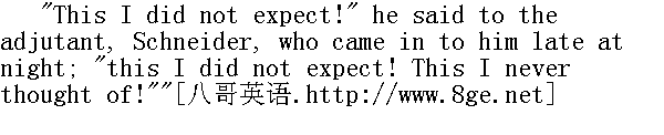 这一点, 这一点我没料到, "他对前来的副官施奈德说, 此时夜已深了, "这一点我没料到!这点我想都没想过!" "You must rest, your highness," said Schneider." 您该休息一下了, 勋座。"副官说。 "Yes; but they shall eat horse-flesh like the Turks!" Kutuzov cried, not heeding him, as he brought his podgy fist down on the table. "They too, shall eat it, if only ...!"" 现在不!他们将会嚼马肉的, 像土耳其人一样, "他没有理睬副官, 咆哮着, 用肌肉松弛的拳头敲桌子, "他们也会的, 如果......
