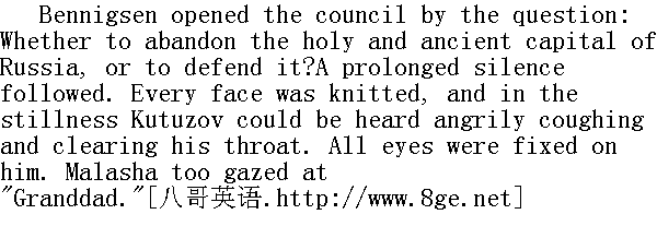 贝尼格森率先发难: "是不战而丢掉俄罗斯神圣的古都呢?还是战而保卫之?"接着是长时间的普遍沉默。大家都阴沉着脸, 寂静中只听到库图佐夫生气地在喉咙管里咳痰。所有的目光都看着他。玛拉莎也看着老爷爷。 She was nearest of all to him, and saw that his face was working; he seemed to be going to cry. But that did not last long. 她离他最近, 看见他愁眉不展, 简直就要哭了。但这一时间却不长。 "The holy and ancient capital of Russia!" he cried suddenly, in a wrathful voice, repeating Bennigsen's words, and thereby underlining the false note in them. "Allow me to tell your excellency that that question has no meaning to a Russian." (He lurched his unwieldy figure forward.) "Such a question cannot be put; there is no sense in such a question. The question I have asked these gentlemen to meet to discuss is the question of the war. The question is: The safety of Russia lies in her army. Is it better to risk the loss of the army and of Moscow by giving battle, or to abandon Moscow without a battle? That is the question on which I desire to learn your opinion." He lurched back into his low chair again." ·俄·罗·斯·神·圣·的·古·都!"他突然发言了, 用愤怒的声音重复一遍贝尼格森的话, 藉以指出这些言辞的虚伪。"请允许我告诉您, 阁下, 这个问题有位俄国人认为没有意义。(他向前探出他那沉重的身躯。)这样的问题不该提出来, 这样的问题没有意义。我请这些先生们来讨论的是一个军事问题。问题如下: '拯救俄国靠军队。牺牲军队和莫斯科冒险打仗值得吗, 还是放弃莫斯科不打这一仗更有利呢?这就是我想知道你们怎么看的那个问题的所在。'"(他摇晃着身躯倒向椅背。) A debate began. Bennigsen did not yet consider that the game was lost. Overruled by the opinion of Barclay and others in admitting the impossibility of maintaining a defensive position at Fili, he proceeded to prove his Russian patriotism and devotion to Moscow by proposing to move the army during the night from the right to the left flank of the position, and to aim a blow at the French right flank next day. Opinions were divided, and arguments were advanced for and against this project. Yermolov, Dohturov, and Raevsky sided with Bennigsen. Led by a feeling that a sacrifice was called for before abandoning the city, and by other personal considerations, these generals seemed unable to grasp that the council then sitting could not affect the inevitable course of events, and that Moscow was already in effect abandoned. The other generals understood this, and leaving the question of Moscow on one side, talked of the direction the army ought to take in retreating.Malasha, who kept her eyes fixed on what was passing before her, saw the council in quite a different light. It seemed to her that the whole point at issue was a personal struggle between "Granddad" and "Longcoat," as she called Bennigsen to herself. She saw that they were angry when they spoke to one another, and in her heart she was on "Granddad's" side. In the middle of the conversation, she caught the swift, subtle glance that "Granddad" gave Bennigsen, and immediately after she noted with glee that "Granddad's" words had put "Longcoat" down. Bennigsen suddenly flushed, and strode angrily across the room. The words that had thus affected Bennigsen were Kutuzov's quietly and softly uttered comment on his proposal to move the troops from the right to the left flank in the night in order to attack the French right. 辩论展开了。贝尼格森并不服输。尽管他同意巴克莱等人认为无法在菲利外围打一场防御战的意见, 但毕竟满怀爱俄国的爱国精神和对莫斯科的深情, 他建议夜间把军队从右翼调往左翼, 第二天进攻法军右翼。赞成和反对该意见的引起争辩, 莫衷一是。叶尔莫洛夫、多赫图罗夫和拉耶夫斯基赞成贝尼格森的意见。不知几位将军是觉得放弃古都前应该作出些牺牲呢, 还是出于其它个人考虑, 但他们似乎不懂得, 此次会议已不能改变事情的进程, 莫斯科现在已经放弃。其他将军倒懂得这点, 已撇开莫斯科问题, 谈起了部队撤离时应向何方转移。玛拉莎目不转睛地瞧着眼前发生的一切, 对会议的意义有不同的理解。她觉得, 一切不过是发生在"老爷爷"和穿长袍者之间的个人争吵, 她管贝尼格森叫穿长袍者。她看出他们俩对话时怒气冲冲, 而她内心里向着老爷爷。在争论中间, 她发觉老爷爷迅速向贝尼格森投去机敏的一瞥, 接着她高兴地察觉老爷爷对穿长袍者说了句什么, 使他偃旗息鼓: 贝尼格森突然涨红了脸, 愤愤地在屋里转来转去。给贝尼格森造成如此影响的话, 是库图佐夫平静地低声地说出的, 关于贝尼格森建议的利弊的意见, 即关于夜间军队从右翼转移至左翼, 好发起对法军侧翼的进攻。 "I cannot approve of the count's plan, gentlemen," said Kutuzov. "Movements of troops in close proximity to the enemy are always risky, and military history affords many examples of disasters arising from them. For instance ..." (Kutuzov seemed to ponder, seeking an example, and then looking with a frank, na?ve expression at Bennigsen) ... "well, the battle of Friedland, which, as I have no doubt the count remembers, was not ... completely successful owing to the change of the position of the troops in too close proximity to the enemy ..."" 先生们, 我"--库图佐夫说, "不能赞赏伯爵的计划。在离敌人的近距离内调动军队, 总是危险的, 军事历史也肯定这个看法。例如......, (库图佐夫仿佛在沉思, 他搜索例子, 用明亮而天真的目光看了贝尼格森一眼。)就拿弗里德兰战役①来说吧, 这一战役, 我想, 伯爵是清楚记得的, 进行得......