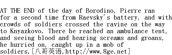 还在波罗底诺战役的尾声, 皮埃尔便又一次逃离拉耶夫斯基的炮垒, 同一群士兵沿河谷向克尼亚济科沃村走去、走到包扎站, 看见血迹, 听到叫喊和呻吟, 便又混在士兵堆中匆忙继续赶路。 The one thing Pierre desired now with his whole soul was to get away from the terrible sensations in which he had passed that day, to get back into the ordinary conditions of life, and to go to sleep quietly indoors in his own bed. He felt that only in the ordinary conditions of life would he be fit to understand himself and all he had seen and felt. But the ordinary conditions of life were nowhere to be found. 皮埃尔现在的全部心思, 是竭望尽快摆脱他在这一天所经历的可怕印象, 回到经常的生活环境, 在自己房间里的床上安稳地睡一觉。只有在惯常的生活条件下, 他才感觉得到他能明白他自己, 明白他所见所亲历的一切。但这样的条件无处可得。 Though bullets and cannon balls were not whistling here on the road along which he was going, still he saw here on all sides the same sights as on the field of battle. There were everywhere the same suffering, exhausted, and sometimes strangely indifferent faces; everywhere the same blood and soldiers' overcoats, the same sound of firing at a distance, yet still rousing the same horror. There was heat and dust besides. 一路上, 虽没有炮弹和子弹的呼啸声, 但前后左右仍然是战场上的同样景象, 仍然是痛苦的、疲惫的却有时奇怪地冷漠的人们, 仍然在流血, 仍然是穿军大衣的士兵, 仍然是射击声, 尽管比较遥远, 但仍然引起恐怖, 此外, 就只有跋涉的闷热和飞扬的尘土。 After walking about three versts along the Mozhaisk road, Pierre sat down by the roadside. 沿莫扎伊斯克公路走了三俄里左右, 皮埃尔在路边坐了下来。 The shadows of night were beginning to fall over the earth, and the roar of cannon died down. Pierre lay leaning on his elbow, and lay so a long while, gazing at the shadows passing by him in the dusk. He was continually fancying that a cannon ball was swooping down upon him with a fearful whiz. He started and sat up. He had no idea how long he had been there. In the middle of the night, three soldiers, dragging branches after them, settled themselves near him and began making a fire. 暮色降临大地, 枪炮的轰鸣也已沉寂。皮埃尔枕着胳膊肘躺下, 他躺了很久, 一面看着在黑暗中经过他身旁的影子。他老觉得, 随着一声可怕的呼啸, 会向他飞来一发炮弹;他哆嗦着抬起一点身子。他记不清在这里呆了多久。半夜, 三位士兵拖来一些干树枝, 在他身旁坐下, 开始点燃火堆。