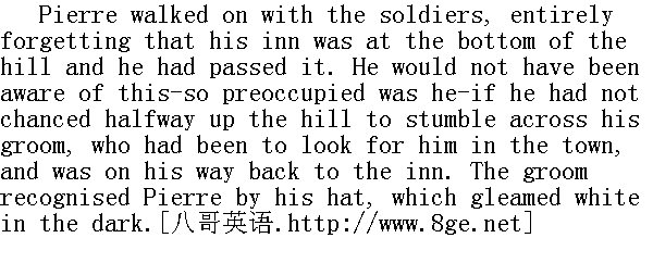 当他们走近莫扎伊斯克, 登上市郊陡峭的山峰, 雄鸡已在高唱。皮埃尔同士兵一道走着, 完全忘记客栈就在山脚下, 他已走过而不知道。要不是他的驯马夫在半山上碰到他, 他是想不起来的(他是如此的丢魂失魄)。驯马夫是去城里寻找他, 现又返回客栈去的, 他从白皮帽上认出了皮埃尔。 "Your excellency!" he cried, "why, we had quite given you up. How is it you are on foot? And, mercy on us, where are you going?"" 爵爷, "他断断续续说, "我们已经绝望了。您怎么是走着来的?您这是上哪儿去啊, 您说说看!" "Oh, to be sure..." said Pierre." 啊, 好了。"皮埃尔说。 The soldiers halted. 士兵停住了脚步。 "Well, found your own folks then?" said one of them." 呶, 怎么, 找到自己人了?"一个问。