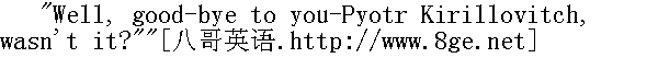 呶, 再见!彼得·基里洛维奇, 是吧? "Good-bye, Pyotr Kirillovitch!" said the other voices. 再见了, 彼得·基里洛维奇!"其余两人的声音说。 "Good-bye," said Pierre, and with the groom he turned in the direction of the inn." 再见。"皮埃尔说, 同他的驯马夫一起往客栈走去。 "I ought to give them something!" thought Pierre, feeling for his pocket. "No, better not," some inner voice prompted him." 该给他们钱!"皮埃尔想, 握住衣兜。"不, 不用。"有一个声音对他说。 There was not a room at the inn: all were full. Pierre went out into the yard, and muffling his head up, lay down in his carriage. 客栈的房间已没有空位子了: 全部客满。皮埃尔穿过院子, 蒙着头在自己马车里躺下睡觉。