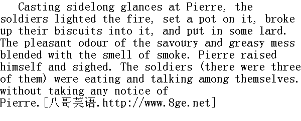 士兵们斜眼看了看皮埃尔, 点燃了火堆, 然后放上一口小锅, 把面包干掰碎放进锅里, 又加了一点腌猪油。沾了油荤的美味食物的香味混合着烟味。皮埃尔坐直了些, 叹了口气。兵士们(他们是三个)吃着, 没有注意皮埃尔, 边吃边谈。 "And what lot will you be one of?" one of the soldiers suddenly asked Pierre, evidently suggesting in this inquiry precisely what Pierre was thinking about. "If you are hungry we'll give you some, only tell us whether you're a true man."" 你是干什么的?"其中一个突然对皮埃尔说, 显然这问题的意思就是皮埃尔心里想的: 假如你想吃, 我们就给, 但你要说, 你是不是老实人? "I?" ... said Pierre, feeling the necessity of minimising his social position as far as possible, so as to be closer to the soldiers and more within their range. "I am really a militia officer, but my company's nowhere about; I came to the battle and lost sight of my comrades."" 我?我......"皮埃尔吞吞吐吐, 觉得有必要尽量降低自己的社会地位, 以便接近兵士们, 便于他们了解。"我是一位民防军官, 真的, 不过这里没有我的弟兄们;我来参加战斗, 和自己人失散了。" "Well! Fancy that!" said one of the soldiers." 瞧你!"一个士兵说。 Another soldier shook his head. 另一个士兵摇了摇头。