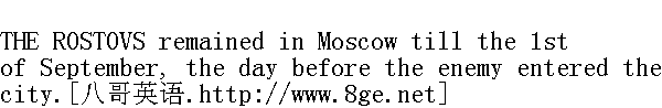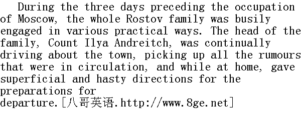 在莫斯科落入敌手之前的三天时间里, 罗斯托夫一家大小都杂乱无章地忙于各种生活琐事。一家之主的伊利亚·安得烈伊奇伯爵天天乘马车在城里各处奔忙, 收集四面八方的传闻, 而在家里对于启程的准备, 只作此浮皮潦草的安排。 The countess superintended the sorting out of things to be packed; she was out of humour with every one, and was in continual pursuit of Petya, who was as continually escaping from her, and exciting her jealousy by spending all his time with Natasha. Sonya was the only person who really undertook the practical business of getting things packed. But Sonya had been particularly silent and melancholy of late. She had been present when Nikolay's letter mentioning Princess Marya had elicited the most delighted deductions from the countess, who saw in Nikolay's meeting with Princess Marya the direct intervention of Providence. 伯爵夫人监督着东西的清理收拾, 对谁都不满意, 时时去照拂一见她就躲开的彼佳, 为他而妒嫉娜塔莎, 因为他总跟她在一起。只有索尼娅一个人料理实际的事务: 收拾包裹。但是索尼娅最后这几天始终特别忧郁和沉默寡言。尼古拉那封提到玛丽亚公爵小姐的信, 使得伯爵夫人高兴地下了断语, 当着她的面说, 在玛丽亚公爵小姐和尼古拉的巧遇上, 她看到上帝的意愿。 "I was never really happy," said the countess, "when Bolkonsky was engaged to Natasha, but I had always longed for Nikolay to marry the princess, and I have always had a presentiment about it. And what a good thing it would be!"" 博尔孔斯基做娜塔莎的未婚夫, 我从来没有高兴过, "伯爵夫人说, "可我总是希望, 而且我有预感, 尼古连卡会娶公爵小姐。这该多好啊!" Sonya felt that this was true; that the only possibility of retrieving the Rostovs' position was by Nikolay's marriage to an heiress, and that the princess would be an excellent match for him. But this reflection was very bitter for her. In spite, or perhaps in consequence, of her sadness, she undertook the difficult task of seeing after the sorting and packing of the household goods, and for whole days together she was busily employed. The count and countess referred to her when they had any orders to give. Petya and Natasha, on the contrary, did nothing to help their parents, but were generally in every one's way, and were only a hindrance. And all day long the house resounded with their flying footsteps and shouts and shrieks of causeless mirth. They laughed and were gay, not in the least because there was reason for laughter. But they were gay and glad at heart, and so everything that happened was reason enough for gaiety and laughter in them. Petya was in high spirits because he had left home a boy, and come back (so every one told him) a fine young man, because he was at home, because he had left Byely Tserkov, where there seemed no hope of being soon on active service, and come to Moscow where there would be fighting in a few days, and above all, because Natasha, whose lead he always followed, was in high spirits. Natasha was gay, because she had too long been sad, and now nothing reminded her of the cause of her sadness, and she was quite strong again. She was gay too, because she needed some one to adore her (the adoration of others was like the grease on the wheels, without which her mechanism never worked quite smoothly), and Petya did adore her. And above all, they were both gay, because there was war at the very gates of Moscow, because there would be fighting at the barriers, because arms were being given out, and everybody was rushing about, and altogether something extraordinary was happening, which is always inspiriting, especially for the young. 索尼娅觉得这是对的。罗斯托夫家业重振的唯一希望, 是娶一房有钱的媳妇, 而公爵小姐就是一个很好的配偶, 但这对她说来太痛苦了。尽管痛苦, 也许正由于痛苦, 她把所有繁杂的如何收拾装箱打包的事全揽了起来, 整整几天地忙碌, 伯爵和伯爵夫人有什么事须要吩咐时, 便去找她。相反, 彼佳和娜塔莎不仅不帮父母的忙, 还大部份时间让家里的所有人感到厌烦和碍事。整天几乎都听得到他们在宅院追逐、叫喊和无缘无故的哈哈大笑。他们高兴地笑闹, 不是因为有值得笑的理由;但他们心里感到高兴和愉快, 所以, 无论发生什么事, 都是他们开心和笑的理由。彼佳高兴, 是因为他离家时是个孩子, 而回来时(大家都对他这样说)已是男子汉大丈夫了, 因为他回到家里还因为离开了白采尔科维, 那地方没有即将投入战斗的希望, 而今回到莫斯科, 几天之内这儿就要打仗。主要的是, 因为一贯影响他情绪的娜塔莎心里高兴。娜塔莎的高兴, 则是由于她忧郁得太久了, 现在已没有什么使她触发忧郁的情绪, 并且, 她身体健康。她高兴, 是还因为有一个人在赞美她(他人的赞美, 是使她的机器运转完全自如的必不可少的齿轮的润滑油), 而彼佳就是这个人。总而言之, 他们俩人高兴, 是因为战争逼进莫斯科, 就要在城墙边打起来, 就要分发武器, 大家在逃跑, 在往别处去, 发生着不寻常的事情, 不寻常的事情对于众人来说, 尤其是对青年人来说, 总是很开心的。