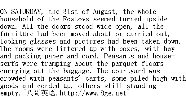 八月三十一日, 星期六, 罗斯托夫府上一切都好像闹了个底朝天。所有房间的门都敞开着, 全部家具搬了出来或挪动了地方, 镜子和画框也取了下来。屋里摆着箱子, 旁边零乱地放着干草、包装纸和绳索。农夫和家奴搬着东西, 沉重地踩着镶木地板走动, 院子里停满了农民的大车, 一些已高高堆满东西并捆扎停当, 一些还是空的。 The voices and steps of the immense multitude of servants and of peasants, who had come with the carts, resounded through the courtyard and the house. The count had been out since early morning. The countess had a headache from the noise and bustle, and was lying down in the new divan-room with compresses steeped in vinegar on her head. Petya was not at home; he had gone off to see a comrade, with whom he was planning to get transferred from the militia to a regiment at the front. Sonya was in the great hall, superintending the packing of the china and glass. Natasha was sitting on the floor in her dismantled room among heaps of dresses, ribbons, and scarfs. She sat gazing immovably at the floor, holding in her hands an old ball-dress, the very dress, now out of fashion, in which she had been to her first Petersburg ball. 屋里屋外, 人声鼎沸, 脚步杂沓, 奴仆们和跟车来的农夫们各自忙活, 此呼彼应。伯爵一早外出不知去向。伯爵夫人由于忙乱和嘈杂而头痛起来, 头上缠着浸了醋的布, 躺在新起居室里。彼佳不在家(他去找他的伙伴, 打算同他一起由民团转为现役军人)。索尼娅在大厅看着包装玻璃器皿和瓷器。娜塔莎坐在搬得凌乱的她的房间地板上, 周围乱堆着衣服, 腰带和围巾, 她手里拿着她初次参加彼得堡舞会穿过的旧舞衣(现已过时), 呆呆地望着地板。 Natasha was ashamed of doing nothing when every one in the house was so busy, and several times that morning she had tried to set to work; but her soul was not in it; and she was utterly unable to do anything unless all her heart and soul were in it. She stood over Sonya while she packed the china, and tried to help; but soon threw it up, and went to her room to pack her own things. At first she had found it amusing to give away her dresses and ribbons to the maids, but afterwards when it came to packing what was left, it seemed a wearisome task. 娜塔莎觉得惭愧, 别人都那么忙, 而她什么事都不做, 于是, 从早上起几次想找点事做;但她又没有心思做事, 没有心思做事时, 她便不能, 也不善于做任何事情, 因为不是全力以赴的缘故。她站着看蹲着包扎瓷器的索尼娅, 想帮帮忙, 但立刻又抛开这边的活儿, 回自己房间去收拾衣物。起初, 她把衣服和腰带分发给女仆, 还满高兴的, 但过了一会儿, 还得收拾剩下的东西, 她又觉得索然无味了。 "Dunyasha, you'll pack it all, dear? Yes? yes?"" 杜尼亚莎, 你来收拾好不好, 亲爱的?是不是?" And when Dunyasha readily undertook to do it all for her, Natasha sat down on the floor with the old ball-dress in her hands, and fell to dreaming on subjects far removed from what should have been occupying her mind then. From the reverie she had fallen into, Natasha was aroused by the talk of the maids in the next room and their hurried footsteps from their room to the backstairs. Natasha got up and looked out of the window. A huge train of carts full of wounded men had stopped in the street. 当杜尼亚莎乐意地把一切应承下来, 娜塔莎坐到地板上, 又捡起旧的舞衣陷入沉思, 但绝不是在思索现在本应占据她脑子的事。隔壁女仆房里使女们的说话声和她们从房里向后门走去的匆忙的脚步声, 把她从沉思中唤醒了。娜塔莎站起来往窗外看。街上停着一长串伤兵车辆。