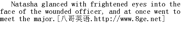 娜塔莎惊吓地向受伤军官的面庞扫了一眼, 即刻朝少校迎面走去。 "May the wounded men stay in our house?" she asked." 可不可以让您的伤兵住到我们家里?"她问。 The major with a smile put his hand to his cap. 少校面带微笑把手举向帽檐。 "What is your pleasure, ma'mselle?" he said, screwing up his eyes and smiling." 您觉得谁住到你们家里好呢, 小姐?"他眯起眼睛微笑着问。 Natasha quietly repeated her question, and her face and her whole manner, though she still kept hold of the corners of the pocket-handkerchief, was so serious, that the major left off smiling, and after a moment's pondering-as though asking himself how far it were possible-he gave her an affirmative answer. 娜塔莎平静地重说了一遍, 虽然她的手依然牵着手绢角, 但她的面庞, 以及她全部举止都是严肃的, 于是, 少校收敛了笑容, 先是考虑, 像是同自己商量这样做的可能性, 然后肯定地回答了她。