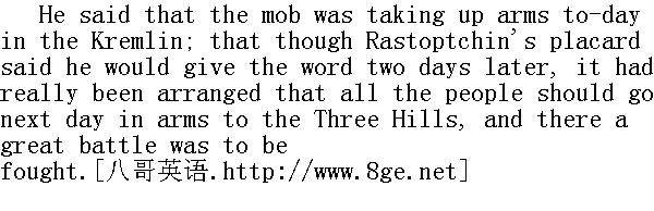 他说, 今天民众都在克里姆林宫领武器, 虽然拉斯托普钦伯爵的通告里说, 他两三天内要发出号令, 但大概已经作出了安排, 命令全体民众带上武器明天去三座山, 那里将要打一场大仗。 The countess looked in timid horror at her son's eager, excited face, as he told them this. She knew that if she said a word to try and dissuade Petya from going to this battle (she knew how he was enjoying the prospect of it), he would say something about the duty of a man, about honour, and the fatherland-something irrational, masculine, and perverse-which it would be useless to oppose, and all hope of preventing him would be gone. And, therefore, hoping to succeed in setting off before this battle, and in taking Petya with her, to guard and protect them on the road, she said nothing to her son, but after dinner called her husband aside, and with tears besought him to take her away as soon as could be, that night if possible. With the instinctive, feminine duplicity of love, though she had till then shown not the slightest sign of alarm, she declared she should die of terror if they did not get away that very night. She was indeed without feigning afraid now of everything. 彼佳讲话时, 伯爵夫人胆怯地望着儿子愉快的神采飞扬的脸庞。她知道, 如果她说出她求彼佳别去参加这场战役(她知道他为即将来临的战役感到高兴), 那他就会讲出男子汉啦, 荣誉啦, 祖国啦等等话来, --讲出这些没有意义的, 男人的固执的无法反对的事, 事情就糟了, 所以, 她指望安排好在打仗之前就走, 她作为一个保护者和庇护者, 带上彼佳走, 暂时什么也不对彼佳讲, 而在饭后叫人请伯爵来, 眼泪汪汪地求他尽快用车子送她走, 就在当晚送她走, 如果来得及的话。一直没露出丝毫畏惧的伯爵夫人, 现在以女人的出于母爱的本能的狡黠对丈夫说, 如果今晚他们不能乘车离开的话, 她便会吓死。用不着假装, 她现在的确什么都怕了。