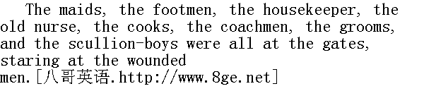 男女仆人, 管家和乳娘, 厨师和马夫, 前导驭手, 打杂的厨役都站在大门口看伤兵。 Natasha flung a white pocket-handkerchief over her hair, and holding the corners in both hands, went out into the street. 娜塔莎用一条白手绢盖住头发, 两手牵住手绢角走出了大门。 The old housekeeper, Mavra Kuzminishna, had left the crowd standing at the gate, and gone up to a cart with a tilt of bast-mats thrown over it. She was talking to a pale young officer who was lying in this cart. Natasha took a few steps forward and stood still timidly, holding her kerchief on and listening to what the housekeeper was saying. 过去的管家玛夫拉·库兹米尼什娜老太婆, 离开聚在门口的人群, 走近一辆有蒲席棚的大车, 同躺在车上的年轻的苍白的军官谈话。娜塔莎挪动了几步, 怯生地停下, 两手仍牵住手绢, 叫管家谈话。 "So you have no one then in Moscow?" Mavra Kuzminishna was saying. "You'd be more comfortable in some apartment.... In our house even. The masters are all leaving."" 怎么您, 这样说来, 在莫斯科一个亲戚朋友也没有?"玛夫拉·库兹米尼什娜说。"您最好找一家安静些的住宅......比如到我们府上。老爷太太要走的。 "I don't know if it would be allowed," said the officer in a feeble voice. "There's our chief officer ... ask him," and he pointed to a stout major who had turned back and was walking along the row of carts down the street." 不知道准不准, "军官有气无力地说, "那是首长......请问问他去, "他指了指一位肥胖的少校, 这个少校正沿着一溜大车往回走来。