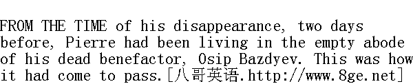 打从家里消失以来, 皮埃尔已在过世的巴兹杰耶夫家的空宅院里住了两天了。事情的始末是这样的。 On waking up the morning after his return to Moscow and his interview with Count Rastoptchin, Pierre could not for some time make out where he was and what was expected of him. When the names of the persons waiting to see him were announced to him-among them a Frenchman, who had brought a letter from his wife, the Countess Elena Vassilyevna-he felt suddenly overcome by that sense of the hopelessness and intricacy of his position to which he was particularly liable. He suddenly felt that everything was now at an end, everything was in a muddle, everything was breaking down, that no one was right nor wrong, that there was no future before him, and that there was no possible escape from the position. Smiling unnaturally and muttering to himself, he sat on the sofa in a pose expressive of utter hopelessness, or got up, approached the door, and peeped through the crack into the reception-room, where his visitors were awaiting him, then turned back with a gesture of despair and took up a book. The butler came in for the second time with a message that the Frenchman who had brought the letter from the countess was very desirous of seeing him if only for a minute, and that they had sent from the widow of Osip Alexyevitch Bazdyev to ask him to take charge of some books, as Madame Bazdyev was going away into the country. 皮埃尔回到莫斯科, 与拉斯托普钦伯爵会见后的次日, 醒来之后, 很久都闹不清楚自己在哪里, 人们要他干什么。有人向他禀告, 在接待室里, 一长串等候他的名人中, 包括一名法国人, 他带来了海伦·瓦西里耶夫娜的信件, 于是, 一种混乱的垂头丧气的心情(他容易受到这种感情支配)又突然把他控制住了。他忽然觉得, 一切到现在都完了, 一切都乱作一团, 一切都毁了, 无所谓对也无所谓错, 前途无望, 也没有摆脱当前处境的出路。他不自然地傻笑, 小声嘟囔着什么, 时而无奈地在沙发上坐下, 时而起身走向门口, 透过门缝往接待室里瞧瞧, 时而又挥挥手踱回来抓起一本书看。管家再次进来禀报皮埃尔: 给伯爵夫人带信的法国人非常想见他, 哪怕是一分钟也行, 同时, 巴兹杰耶夫的遗孀请他去接受图书, 因为巴兹杰耶娃女士要到乡间去了。 "Oh, yes, in a minute; wait ... No, no; go and say, I am coming immediately," said Pierre." 啊, 是的, 马上, 等一等......不, 不, 你先去说我就来。"皮埃尔对管家说。 As soon as the butler had left the room, Pierre had taken up his hat, which was lying on the table, and gone out by the other door. He found no one in the corridor. Pierre walked the whole length of the corridor to the staircase, and frowning and rubbing his forehead with both hands, he went down as far as the first story landing. The porter was standing at the front door. A second staircase led from the landing to the back entrance. Pierre went down the back stairs and out into the yard. No one had seen him. But as soon as he turned out at the gates into the street, the coachman, standing by the carriages, and the gate-porter saw him and took off their caps to him. Aware of their eyes fixed on him, Pierre did, as the ostrich does, hiding its head in a bush to escape being seen; ducking his head and quickening his pace he hurried along the street. 但是, 当管家一出房间, 皮埃尔就拿起桌上的帽子, 便从后面的门走出了书斋, 走廊里一个人也没有。他穿过长长的走廊到了楼梯口, 皱着眉头用双手抹了抹额头, 下到第一道平台。守门人守在大门口。皮埃尔来到的这道台阶又有梯级通向后门。皮埃尔顺着这阶梯走到了院子里。谁也没有看见他。但当他走出后门到了街上时, 站在马车旁的车夫和看院子的人看见了老爷, 向他脱帽致敬。皮埃尔感到众人投过来的目光, 像驼鸟把头埋在灌木丛中以免被人看见一样, 低下头, 并加快了步伐, 沿着大街走去。 Of all the business awaiting Pierre that morning, the task of sorting the books and papers of Osip Alexyevitch seemed to him the most urgent. 在皮埃尔今天早晨要做的事情中, 收拾整理约瑟夫·阿列克谢耶维奇的图书文件对他说来是最重要的。