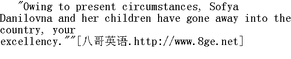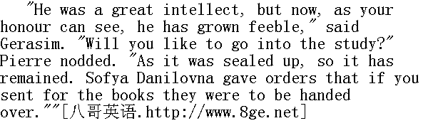 由于目前的时局关系, 索菲娅·丹尼洛夫娜带着孩子到托尔若克乡下去, 爵爷。" "I'll come in, all the same; I want to look through the books," said Pierre." 我还得进来, 我要请理一下书籍。"皮埃尔说。 "Pray do, you are very welcome; the brother of my late master-the heavenly kingdom be his!-Makar Alexyevitch has remained, but your honour is aware he is in feeble health," said the old servant." 请吧, 欢迎大驾, 亡主--愿他升入天堂--他的弟弟马卡尔·阿列克谢耶维奇留下了, 可是, 不瞒您说, 他身体虚弱。"老仆人说。 Makar Alexyevitch was, as Pierre knew, a brother of Osip Alexyevitch, a half-mad creature, besotted by drink. 马卡尔·阿列克谢耶维奇, 正如皮埃尔所知, 是神志不大清醒的嗜酒如命的人, 是约瑟夫·阿列克谢耶维奇的弟弟。 "Yes, yes, I know. Let us go in," said Pierre, and he went into the house. A tall, bald old man in a dressing-gown, with a red nose and goloshes on his bare feet, was standing in the vestibule; seeing Pierre, he muttered something angrily, and walked away into the corridor." 对, 对, 我知道。咱们进去吧, 进去吧......"皮埃尔说着进了屋。一个高大秃顶红鼻子的老头, 身穿外套, 光脚穿套鞋站在前厅。看见皮埃尔, 他不满地嘟哝了几句, 走到了走廊里。