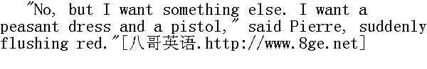 不, 但我需要别的东西。我要一套农民的衣服和一支手枪。"皮埃尔说, 脸突然发红。 "Certainly, sir," said Gerasim, after a moment's thought." 遵命。"格拉西姆想了想说。 All the rest of that day Pierre spent alone in his benefactor's study pacing restlessly from one corner to the other, as Gerasim could hear, and talking to himself; and he spent the night on a bed made up for him there. 这一天的剩余时间, 皮埃尔独自一人在慈善家的书斋里度过, 不安地从这头走到那头, 格拉西姆听得出来, 他在自言自语, 最后就睡在书斋里为他安排的床铺上, 度过了一夜。 Gerasim accepted Pierre's taking up his abode there with the imperturbability of a servant, who had seen many queer things in his time, and he seemed, indeed, pleased at having some one to wait upon. Without even permitting himself to wonder with what object it was wanted, he obtained for Pierre that evening a coachman's coat and cap, and promised next day to procure the pistol he required. Makar Alexyevitch twice that evening approached the door, shuffling in his goloshes, and stood there, gazing with an ingratiating air at Pierre. But as soon as Pierre turned to him, he wrapped his dressing-gown round him with a shamefaced and wrathful look, and hastily retreated. Pierre put on the coachman's coat, procured and carefully fumigated for him by Gerasim, and went out with the latter to buy a pistol at the Suharev Tower. It was there he had met the Rostovs. 素来就有仆人伺候人的习惯的, 一生见过许多稀奇古怪事情的格拉西姆, 对皮埃尔迁来暂住并不吃惊, 而且, 有一个人让他伺候似乎很满意。当晚, 他连想也不想这些东西有什么用处, 就给皮埃尔搞来一件车夫大褂和毡帽, 并答应第二天搞到他要的手枪。马卡尔·阿列克谢耶维奇, 这天晚上趿着套鞋两次来到房门口, 停下来讨好地看着皮埃尔。但当皮埃尔转身看他时, 他便又害羞又生气地裹紧外套匆忙走开。就在皮埃尔身穿格拉西姆搞来并蒸煮过的车夫大褂, 同他一道去苏哈列夫塔楼买手枪时, 碰到了罗斯托夫一家人。