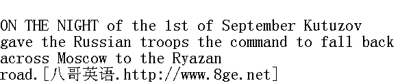 九月一日晚, 库图佐夫发布了俄军经莫斯科撤退至梁赞公路的命令。 The first troops moved that night, marching deliberately and in steady order. But at dawn the retreating troops on reaching the Dorogomilov bridge saw before them, crowding on the other side, and hurrying over the bridge, and blocking the streets and alleys on the same side, and bearing down upon them from behind, immense masses of soldiers. And the troops were overtaken by causeless panic and haste. There was a general rush forward towards the bridge, on to the bridge, to the fords and to the boats. Kutuzov had himself driven by back streets to the other side of Moscow. 夜里开拔了首批部队, 这支夜间行军的队伍从容不迫, 缓慢地庄重地前进, 但在黎明出发的部队快要行至多罗戈米洛夫桥时, 就向前望去, 在另一边, 是拥挤的匆忙过桥的军队, 而在这一边, 是拥塞大街小巷的军队, 在队伍后面, 是接踵而来的望不到尽头的庞大队伍。毫无缘由的匆忙和惊慌支配着军队。人人争先恐后地挤向桥头, 挤上桥去, 或者挤向浅滩, 挤上渡船。库图佐夫吩咐随从把马车从后街绕到莫斯科的另一边去。 At ten o'clock in the morning of the 2nd of September the only troops left in the Dorogomilov suburbs were the regiments of the rear-guard, and the crush was over. The army was already on the further side of Moscow, and out of the town altogether. 到九月二日上午十点钟为止, 在多罗戈米洛夫郊野只剩下后卫部队了。军队已经到了莫斯科的另一侧, 有的已经到了莫斯科以远。 At the same time, at ten o'clock in the morning of the 2nd of September, Napoleon was standing in the midst of his troops on Poklonny Hill, gazing at the spectacle that lay before him. From the 26th of August to the 2nd of September, from the day of Borodino to the entrance into Moscow, all that agitating, that memorable week, there had been that extraordinarily beautiful autumn weather, which always comes as a surprise, when though the sun is low in the sky it shines more warmly than in spring, when everything is glistening in the pure, limpid air, so that the eyes are dazzled, while the chest is braced and refreshed inhaling the fragrant autumn air; when the nights even are warm, and when in these dark, warm nights golden stars are continually falling from the sky, to the delight or terror of all who watch them. 与此同时, 在九月二日上午十点, 拿破仑随同自己的军队站在波克隆山上, 望着展开在他面前的景观。自八月二十六日起, 至九月二日当天止, 从波罗底诺战役到敌人进占莫斯科, 这整个惊惶的可堪记忆的一周的全部日子, 都是不寻常的令人吃惊的大好秋光, 低垂的太阳照耀得比春天更温暖, 在爽朗明净的空气中, 万物闪闪发光, 令人目眩, 呼吸这沁人的空气, 令你心胸振奋而舒适, 就连夜晚也是温暖的, 在这一周的漆黑而温暖的夜里, 不时从天上撒落金色的星星, 真令人又惊又喜。 At ten o'clock on the 2nd of September the morning light was full of the beauty of fairyland. From Poklonny Hill Moscow lay stretching wide below with her river, her gardens, and her churches, and seemed to be living a life of her own, her cupolas twinkling like stars in the sunlight. 九月二日上午十点, 就是这样的天气。晨光魔幻般美妙。莫斯科从波克隆山起, 向前广阔地伸展, 河水蜿蜒, 花园和教堂星罗棋布, 屋宇的穹窿在阳光下有如星星般闪烁, 它似乎在过着日常生活。