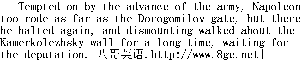 "We shall have to tell him all the same," said some gentleman of the suite.... "But, gentlemen ..." The position was the more difficult as the Emperor, pondering on his magnanimous plans, was walking patiently up and down before the map of the city, shading his eyes to look from time to time along the road to Moscow, with a proud and happy smile. " Ⅰl faudra le lui dire tout de meme......"①侍从官们说。"Mais messieurs......"②情形更加严重了, 因为皇帝正在推敲自己的仁政计划, 时而耐心地走近地图, 时而手搭凉棚望着通往莫斯科的路上, 开心地高傲地微笑着。 ①然而总得告诉他...... "But it's awkward ..." the gentlemen-in-waiting kept repeating, shrugging their shoulders and unable to bring themselves to settle the terrible word in their minds: "le ridicule...." "Mais c'est impossible......"③侍从官们耸耸肩膀说, 迟疑不决, 怕说出大家都想到的可怕的字眼: le ridicule...... ③但不方便......不可能...... Meanwhile the Emperor, weary of waiting in vain, and with his actor's instinct feeling that the great moment, being too long deferred, was beginning to lose its grandeur, made a sign with his hand. A solitary cannon shot gave the signal, and the invading army marched into Moscow-at the Tver, the Kaluga, and the Dorogomilov gates. More and more rapidly, vying with one another, at a quick run and a trot, the troops marched in, concealed in the clouds of dust they raised, and making the air ring with their deafening shouts. 这时, 皇帝由于徒劳的等待而感到疲倦了, 他以演员的敏锐感觉出, 庄严的时刻拖得过长而开始丧失其庄严意, 便做了个手势。信号炮发出了单调的声音, 于是, 包围莫斯科的军队便从特维尔、卡卢日斯基和多罗戈米洛夫等城门开进莫斯科。军队愈走愈快, 互相追赶, 快步或小跑地前进着, 在自己脚步掀起的尘雾中渐渐地不知去向, 汇成一片的吼叫声震撼上空。