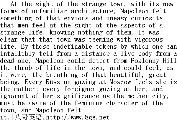 面对从未见过的, 建筑式样奇特的怪城, 拿破仑心里难免有点嫉妒和不安的好奇, 就像人们面对彼此隔膜的异邦生活方式一样。显然, 这座城市仍然开足了马力, 在照常运转, 从远处模糊不清的迹像看来, 他仍能准确无误地辨认出那不同于死尸的活的躯体, 拿破仑从波克隆山上看到城里生活的脉冲, 似乎感到这一巨大而美丽的躯体在呼吸。 "This Asiatic city with the innumerable churches, Moscow the holy. Here it is at last, the famous city! It was high time," said Napoleon; and dismounting from his horse he bade them open the plan of Moscow before him, and sent for his interpreter, Lelorme d'Ideville. 任何一个俄国人, 观看莫斯科, 便会觉得它是母亲;任何一个外国人, 观看它时, 如不了解它这母亲的涵义, 也定能体会到这个城市的女性之格, 这一点, 拿破仑也是感觉到的。 "A city occupied by the enemy is like a girl who has lost her honour," he thought (it was the phrase he had uttered to Tutchkov at Smolensk). And from that point of view he gazed at the Oriental beauty who lay for the first time before his eyes. He felt it strange himself that the desire so long cherished, and thought so impossible, had at last come to pass. In the clear morning light he gazed at the town, and then at the plan, looking up its details, and the certainty of possessing it agitated and awed him. "Cette ville asiatique aux innombrables eglises, Moscou la sainte.La-voila donc enfin, cette fameuse ville!Ⅰl etait temps."①拿破仑说, 随后爬下马鞍, 吩咐把这个Moscue的地图给他摊开, 并把翻译官勒洛涅·狄德维勒叫到跟前。"Une ville occup e par l'ennemi ressembie a une fille qui a perdu son honneur."②他想, (就像他在斯摩棱斯克对图奇科夫所说的那样)。同时, 他就以这一观点瞧着躺在他脚下的, 他还从未见过的东方美人。他本人都觉得奇怪的是, 他想望已久的, 曾经似乎不可能实现的愿望, 终于实现了。在明朗的晨光中, 他时而看看城市, 时而看看地图, 审查这座城市的详细情形, 占领它的坚定的信心使他又激动又恐惧。 ①在这座亚洲城市有数不清的教堂, 莫斯科, 他们的神圣的莫斯科!终于到了这座名城!时候到了。 "But how could it be otherwise?" he thought. "Here is this capital, she lies at my feet awaiting her fate. Where is Alexander now, and what is he thinking? A strange, beautiful, and grand city! And a strange and grand moment is this! In what light must I appear to them?" he mused, thinking of his soldiers. "Here is the city-the reward for all those of little faith," he thought, looking round at his suite and the approaching troops, forming into ranks."One word of mine, one wave of my arm, and the ancient capital of the Tsar is no more. But my clemency is ever prompt to stoop to the vanquished. I must be magnanimous and truly great. But no, it is not true that I am in Moscow," the idea suddenly struck him. "She lies at my feet, though, her golden domes and crosses flashing and twinkling in the sun. But I will spare her. On the ancient monuments of barbarism and despotism I will inscribe the great words of justice and mercy ... Alexander will feel that more bitterly than anything; I know him." (It seemed to Napoleon that the chief import of what had happened lay in his personal contest with Alexander.) "From the heights of the Kremlin-yes, that's the Kremlin, yes-I will dictate to them the laws of justice, I will teach them the meaning of true civilisation, I will make the generations of boyards to enshrine their conqueror's name in love. I will tell the deputation that I have not sought, and do not seek, war; but I have been waging war only with the deceitful policy of their court; that I love and respect Alexander, and that in Moscow I will accept terms of peace worthy of myself and my peoples. I have no wish to take advantage of the fortune of war to humiliate their honoured Emperor. 'Boyards,' I will say to them, 'I do not seek war; I seek the peace and welfare of all my subjects.' But I know their presence will inspire me, and I shall speak to them as I always do, clearly, impressively, and greatly. But can it be true that I am in Moscow! Yes, there she is!"" 难道有可能不是这样吗?"他想, "这就是它, 这个国都;它躺在我的脚下, 等待厄运的降临。亚历山大现时在哪儿, 他又在想什么呢?奇怪美丽雄伟的城啊!奇特而庄严的时刻啊!我以什么样子去见他们呢?"他想到他的军队, "这就是它--对所有不够忠诚的官兵的奖励, "他边想边扫视身边的, 以及走拢来整队集合的队伍。"我只须一句话, 只须一举手, 这座des czars③古都就完蛋了。Mais ma cl mence est toujours prompte a descendre sur les vaimcus④.我应该宽怀和真正地伟大......但是不, 不对, 我在莫斯科是不真实的, "这想法突然出现在他脑际。"可它明明在我脚下, 在阳光下炫耀着它金色的穹窿和十字架。但我会宽恕它的。在古老的野蛮和奇制的纪念碑上, 我将写下正义和仁慈的伟大辞句......亚历山大最能明白的正是这点, 我知道他。(拿破仑觉得, 当前发生着的事件的主要意义, 在于他同亚历山大个人之间的斗争。)从克里姆林宫的高楼, --是的, 这是克里姆林宫, 对--我将颁布正义的法律, 我将晓谕他们真正文明的含意, 我将让世世代代的大臣们, 以敬爱之心记住征服者的名字。我将告诉代表团, 我过去和现在都不要战争;我只是对他们宫廷的错误政策进行一场战争, 我爱亚历山大并尊敬地, 我将在莫斯科接受符合我以及我的人民的尊严的和平条件。我不想趁战争之机以羞辱尊敬的陛下。各位大臣--我告诉他们--我不要战争, 我希望我所有臣民享受和平和福祉。而且, 我知道, 他们的到来