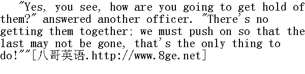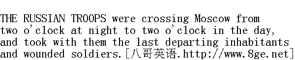 俄军从夜间两点到次日下午两点穿过莫斯科, 尾随其后的是最后撤离的居民和伤兵。 The greatest crush took place on the Kamenny bridge, the Moskvoryetsky bridge, and Yauzsky bridge. While the troops, parting in two about the Kremlin, were crowding on to the Moskvoryetsky and Kamenny bridges, an immense number of soldiers availed themselves of the stoppage and the block to turn back, and slipping stealthily and quietly by Vassily the Blessed, and under the Borovitsky gates, they made their way uphill to the Red Square, where some instinct told them they could easily carry off other people's property. Every passage and alley of the Gostinny bazaar was filled with a crowd, such as throngs there at sales. But there were no ingratiating, alluring voices of shopmen, no hawkers, no motley, female mob of purchasers-everywherewere the uniforms and overcoats of soldiers without guns, going out in silence with loads of booty, and coming in empty-handed. The shopkeepers and shopmen (they were few) were walking about among the soldiers, like men distraught, opening and shutting their shops, and helping their assistants to carry away their wares. There were drummers in the square before the bazaar beating the muster-call. But the roll of the drum made the pillaging soldiers not run up at the call as of old, but, on the contrary, run away from the drum. Among the soldiers in the shops and passages could be seen men in the grey coats, and with the shaven heads of convicts. Two officers, one with a scarf over his uniform, on a thin, dark grey horse, the other on foot, wearing a military overcoat, stood at the corner of Ilyinka, talking. A third officer galloped up to them. 行军时, 在石桥、在莫斯科河桥和雅乌兹河桥上, 发生了异常拥挤的现象。在军队分两路绕过克里姆林宫, 聚集到莫斯科河桥和石桥上时, 大量士兵趁那短暂停留、互相拥挤的机会, 从桥头折回, 偷偷摸摸地窜过瓦西里·布拉任内教堂, 经博罗维茨基城门回到红场附近的小山上。他们凭着某种感觉, 觉得在那里可以轻而易举地拿走别人的东西。这一群家伙, 像买便宜货一样, 挤满了商场内的大小各条通道。但已听不到店员甜言蜜语劝购的声音, 看不到小贩和五颜六色的女顾客--只有士兵的制服和大衣在晃动, 士兵们没带武器, 空手进去, 默默地走出来时全身已鼓鼓囊囊。商人和掌柜(人不太多)像丢了魂似的在士兵中穿行, 打开店铺, 进去再拴上门, 然后同伙计一道把货物搬往别处。商场附近的广场上站着军鼓队, 在敲集合鼓。但是鼓声并不能使抢劫的士兵像从前那样跑步集合, 他们反而跑得离军鼓更远了。在士兵中间, 在店铺里外和过道上, 看得见一些穿灰长褂、剃光头的人①。两名军官, 一个制服上扎了腰带, 骑一匹灰黑的瘦马, 另一个穿大衣徒步, 站在伊利英卡街拐角上交谈。第三名军官骑马向他们走来。 ①指从监狱释放出来的囚犯。 "The general has sent orders that they positively must all be driven out. Why, this is outrageous! Half the men have run off."" 将军下令无论如何得立即把他们赶出来。这算什么, 太不成体统!一半人跑散了。" "Why, are you off too? ... Where are you fellows off to?" ... he shouted to three infantry soldiers, who ran by him into the bazaar without guns, holding up the skirts of their overcoats. "Stop, rascals!"" 你去哪儿?......你们去哪儿?......"他朝三名步兵大声问, 这三人没带武器, 提着大衣下摆, 正经过这里往市场溜。"站住, 混蛋!"