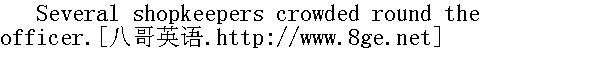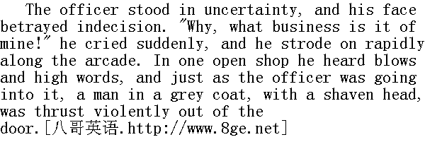 能让他们集合吗?"另一个军官答话。"你集合不起来的;得快点走, 免得剩下的人再跑, 只能这样!" "How's one to push on? There they have been standing, with a block on the bridge, and they are not moving. Shouldn't a guard be set to prevent the rest running off?"" 怎样走呢?--都停在那里, 挤在桥上一动不动的。要末布置一条封锁线阻止剩下的人逃跑, 好吗?" "Why, come along! Drive them out," shouted the senior officer." 行啦, 快往那边去!把他们赶出来。"上级军官吼叫着。 The officer in the scarf dismounted, called up a drummer, and went with him into the arcade. Several soldiers in a group together made a rush away. A shopkeeper, with red bruises on his cheeks about his nose, with an expression on his sleek face of quiet persistence in the pursuit of gain, came hurriedly and briskly up to the officer gesticulating. 扎腰带的军官翻身下马, 叫来一个鼓手, 同他一起走进商场拱门。几个士兵撒腿一齐跑掉了。一个鼻子周围发生了一圈红包丘疹的商人, 富态的脸上现着镇定的精明的神气, 急忙而潇洒地晃着胳膊来到军官面前。 "Your honour," said he, "graciously protect us. We are not close-fisted-any trifle now ... we shall be delighted! Pray, your honour, walk in, I'll bring out cloth in a moment-a couple of pieces even for a gentleman -we shall be delighted! For we feel how it is, but this is simple robbery! Pray, your honour! a guard or something should be set, to let us at least shut up ..."" 大人, "他说, "行行善吧, 保护我们吧。这儿无论什么东西我们都不当一回事, 我们乐意奉送。请吧, 我现在就抱呢料出来。对您这样高贵的人物, 就是送两匹也成, 悉叫尊便!因为我们觉得, 怎么说呢, 简直是抢劫!劳驾了!能不能派个岗哨让我们关上门......"