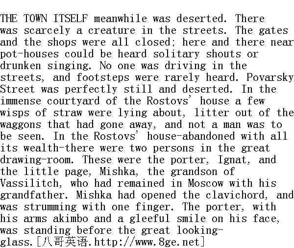 城内此时是空旷寂寞。大街上几乎没有一个行人。住户的大门和店铺都上了锁, 只在一些酒馆附近听得见吼叫或是醉汉的哼唱。街上没有人驶行, 行人的脚步声也很少听得见。波瓦尔大街一片沉寂荒凉。罗斯托夫府邸的院子里, 撒着草料屑和马的粪便, 却不见一个人影。在罗斯托夫连财产也全部留下来了的府上, 有两个人待在大客厅里。这是看门人伊格纳特和小家伙米什卡, 他是同爷爷瓦西里奇一道留在莫斯科的。米什卡打开克拉维珂琴盖①, 用一个指头弹了起来。看门人双手叉腰笑嘻嘻地站在大穿衣镜前面。 ①clavichord之音译, 或译"翼琴", 今又称古钢琴, 因系现代钢琴piano之前身, 但当时并不古。 "That's fine, eh, Uncle Ignat?" said the boy, beginning to bang with both hands at once on the keys." 弹得多好啊!啊?伊格纳特叔叔!"小孩说, 突然两只手都在键盘上拍打起来。 "Ay, ay!" answered Ignat, admiring the broadening grin on his visage in the glass." 啧啧, 你呀!"伊格纳特回答, 望着镜子里愈来愈高兴的笑容, 他很是惊奇。 "Shameless fellows! Shameless, upon my word!" they heard behind them the voice of Mavra Kuzminishna, who had softly entered. "The fat-faced fellow grinning at himself! So this is what you are at! It's not all cleared away down there, and Vassilitch fairly knocked up. You wait a bit!"" 不害臊!真不害臊!"两人背后传来悄悄进屋的玛夫拉·库兹米尼什娜的声音。"瞧他那个大胖脸, 龇牙咧嘴。养你们干这个!那边什么都没收掇好呢, 瓦西里奇累坏了。等着给你算帐!"