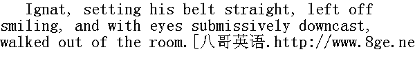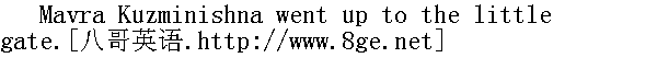 伊格纳特整理好腰带, 收敛起笑容, 驯服地垂下眼睛, 赶忙走出屋子。 "Auntie, I was only just touching ..." said the boy." 大婶, 我轻轻弹了一下。"小孩说。 "I'll teach you only just to touch. Little rascal!" cried Mavra Kuzminishna, waving her hand at him. "Go and set the samovar for your granddad."" 我也轻轻揍你一下, 小淘气鬼!"玛夫拉·库兹米尼什娜朝他挥手喊道: "去, 给爷爷烧茶。" Brushing the dust off, she closed the clavichord, and sighing heavily went out of the drawing-room and closed the door. Going out into the yard Mavra Kuzminishna mused where she would go next: whether to drink tea in the lodge with Vassilitch, or to the storeroom to put away what still remained to be stored away. 玛夫拉·库兹米尼什娜掸掸灰尘, 合上了克拉维珂琴盖。然后重重地叹了一口气, 出了客厅, 锁上了房门。走到院子里, 玛夫拉·库兹米尼什娜想了想该去哪儿: 去瓦西里奇厢房喝茶呢, 还是去库房收拾还没收拾好的东西。 There was a sound of rapid footsteps in the still street. The steps paused at the gate, the latch rattled as some hand tried to open it. 寂静的街上响起了急促的脚步声。脚步声在门旁停住了。门闩发出了响声, 一只手用力推开它。