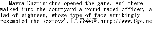 玛夫拉·库兹米尼什娜打开了便门, 走到院子里来的是一个十七八岁, 圆脸、脸型像罗斯托夫家的军官。 "They have gone away, sir. Yesterday, in the evening, their honours set off," said Mavra Kuzminishna cordially. The young officer standing in the gateway, as though hesitating whether to go in or not, gave a click with his tongue expressive of disappointment." 都走啦, 少爷。昨天傍晚走的, "玛夫拉·库兹米尼什娜客气地说。年轻的军官站在便门里, 好像有点犹豫不决--是进屋还是不进屋去--的样子, 他弹了一下舌头。 "Ah, how annoying!" he said. "Yesterday I ought to ... Ah, what a pity ..."" 噢, 太遗憾了!"他说, "我本应该昨天......噢, 真遗憾!......" Meanwhile Mavra Kuzminishna was intently and sympathetically scrutinising the familiar features of the Rostov family in the young man's face, and the tattered cloak and trodden-down boots he was wearing. "What was it you wanted to see the count for?" she asked. 玛拉夫·库兹米尼什娜同情地仔细从年轻人脸上, 察看她所熟悉的罗斯托夫血缘的特征, 又看看他身上的挂破了的军大衣和破旧的皮靴。"您为什么要来找伯爵呢?"他问。 "Well ... what am I to do now!" the officer cried, with vexation in his voice, and he took hold of the gate as though intending to go away. He stopped short again in uncertainty." 那就......没法了!"军官沮丧地说, 抓住门像是要走。他又迟疑地停下。
