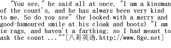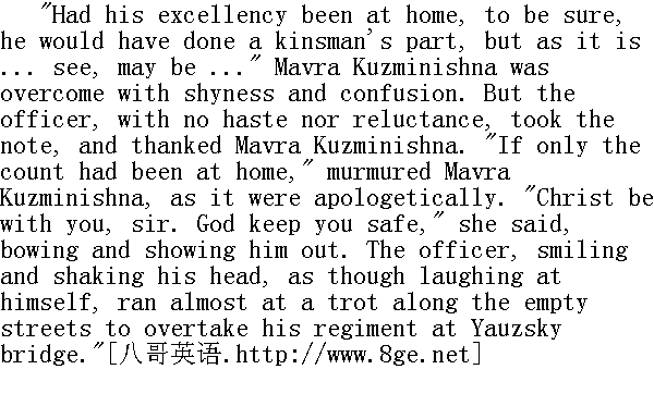 您看出来了没有?"突然他说, "我是伯爵的家属, 他一向对我很好。现在, 您瞧见没有(他友好地愉快地微笑着看了自己的大衣和皮靴), 都穿破了, 可钱又没有, 我想请求伯爵......" Mavra Kuzminishna did not let him finish. 玛夫拉·库兹米尼什娜不让他说下去。 "Would you wait just a minute, sir? Only one minute," she said. And as soon as the officer let go of the gate, Mavra Kuzminishna turned, and with her rapid, elderly step hurried into the back court to her lodge." 您稍稍等一下, 少爷。就一分钟, "他说。军官刚刚把手从门上放下, 玛夫拉·库兹米尼什娜就已转身, 以老太婆的快步子向后院自己的厢房走去。 While she was running to her room, the officer, with downcast head and a faint smile, was pacing up and down the yard, gazing at his tattered boots. 在玛夫拉·库兹米尼什娜跑回自己屋子的这段时间, 军官低下头望着已裂开的皮靴, 脸上有些许笑意, 在院子里蹓跶。" "What a pity I have missed uncle! What a nice old body! Where has she run off to? And how am I to find out the nearest way for me to overtake the regiment, which must be at Rogozhsky by now?" the young officer was musing meanwhile. Mavra Kuzminishna came round the corner with a frightened and, at the same time, resolute face, carrying in her hands a knotted check handkerchief. A few steps from him, she untied the handkerchief, took out of it a white twenty-five rouble note, and gave it hurriedly to the officer. 真遗憾, 没碰到叔叔。但是老太婆很好啊!她跑到哪儿去了?我又怎么会知道, 走哪些街道可以抄近路赶上团队呢?他们现在恐怕走到罗戈日城门了呢。"年轻军官在这一时刻想着。玛夫拉·库兹米尼什娜神情惊慌却又坚定, 手里捧着一个裹好的方格头巾, 从一个角落出来。在走到离军官几步远的地方, 她便解开头巾, 拿出里面那张白色的二十五卢布钞票, 急忙递给他。