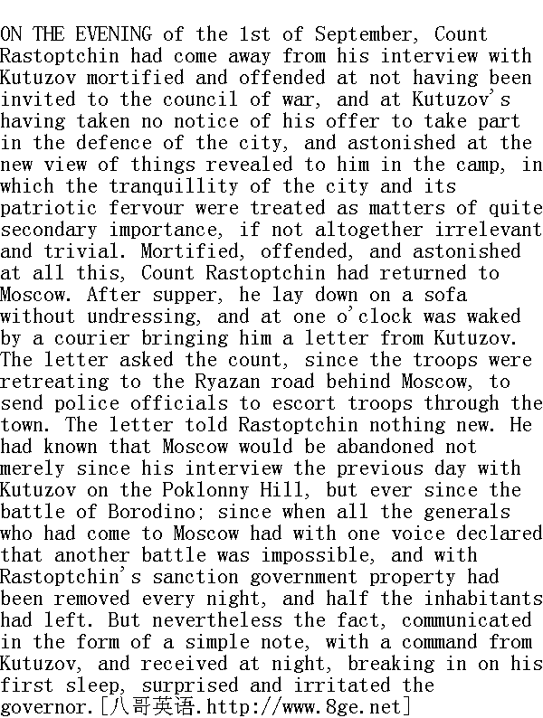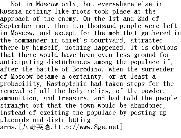 九月一日晚, 同库图佐夫会面之后, 拉斯托普钦伯爵感到伤心, 认为受了凌辱, 因为他未被邀请参加军事会议, 库图佐夫对他所提出关于参加保卫古都的建议未予注意;同时, 他还对大本营向他表示的一个新看法感到震惊, 持这一看法, 古都保持平静, 古都的爱国热情等不仅是次要的, 而且是全无必要的, 微不足的, --为所有这一切伤心, 受辱和震惊的拉斯托普钦伯爵回到了莫斯科。晚饭后, 伯爵未脱衣服在沙发上就寝, 十二点过后便被递交库图佐夫便函的信使唤醒了。便函称, 由于部队要撤往莫斯科以东的梁赞公路, 故问伯爵能否通融派出警宪官员引导部队通过城市, 这一消息对拉斯托普钦已非新闻。不仅从昨天库图佐夫在波克隆山会面时算起, 还要从波罗底诺战役算起--当时, 所有会聚莫斯科的将军众口一词地说, 不能再发起战役了;同时, 在伯爵许可下, 每晚都在运出公家的财产, 居民也撤走一半--拉斯托普钦伯爵就已知道, 莫斯科必将放弃;但是, 以带有库图佐夫命令的便笺形式通知的、在夜间刚入睡时收到的这个消息, 仍使伯爵惊讶和气愤。 In later days, Count Rastoptchin, by way of explaining his action during this time, wrote several times in his notes that his two great aims at that time were to maintain tranquillity in Moscow, and to make the inhabitants go out of it. If this twofold aim is admitted, every act of Rastoptchin's appears irreproachable. Why were not the holy relics, the arms, the ammunition, the powder, the stores of bread taken away? Why were thousands of the inhabitants deceived into a belief that Moscow would not be abandoned and so ruined? "To preserve the tranquillity of the city," replies Count Rastoptchin's explanation. Why were heaps of useless papers out of the government offices and Leppich's balloon and other objects carried away? "To leave the town empty," replies Count Rastoptchin's explanation. One has but to admit some menace to public tranquillity and every sort of action is justified. 后来, 拉斯托普钦伯爵在解释这期间自己的行动时, 多次在回忆录中写道, 他当时有两项重要目标: de maintenir la tranquillite a Moscou et d'en faire partir les habitants.①如果认可这一双重目标, 拉斯托普钦的任何行动都是无可非议的。为什么不运走莫斯科的圣物、武器、子弹、火药和粮食储备, 为什么欺骗成千万居民, 说不会放弃莫斯科, 不会把它毁灭掉呢?为了保持都城的平静, 拉斯托普钦伯爵如此解释说。为什么运走政府机关一捆捆无用的文件, 列比赫气球和别的物品呢?为的是使它变成一座空城, 拉斯托普钦伯爵如此解释说。只要假设有什么事威胁着民众的安定, 一切行为都是说得过去的。 ①保持莫斯科的平静, 疏散居民。 All the horrors of terrorism were based only on anxiety for public tranquillity. 恐怖措施的全部可怕之处, 就是以关心民众的安定作为依据。 What foundation was there for Count Rastoptchin's dread of popular disturbance in Moscow in 1812? What reason was there for assuming a disposition to revolution in the city? The inhabitants were leaving it; the retreating troops were filling Moscow. Why were the mob likely to riot in consequence? 拉斯托普钦伯爵有什么根据为一八一二年莫斯科民众的安定而担心?设想城里有骚动趋势的理由是什么?居民走了, 军队后撤时挤满了莫斯科。结果, 民众便会暴动, 这是为什么呢?