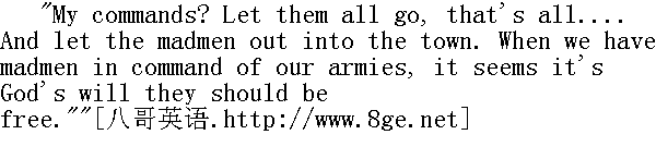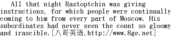 有何指示吗?让他们都走, 就这样......疯子嘛让他们都到城内去, 放了就是了。我们这边是由疯子指挥军队, 上帝就是这样安排的。" To the inquiry about the convicts in the prison, the count shouted angrily to the overseer: 对于蹲在监狱里的囚犯问题, 伯爵呵斥典狱官: "What, do you want me to give you two battalions for a convoy for them, when we haven't any battalions at all? Let them all go, and that settles it!"" 怎么, 派给你两营人护送吗?派不出!放掉他们就完事了!" "Your excellency, there are political prisoners-Myeshkov, Vereshtchagin ..."" 爵爷, 还有政治犯: 梅什科夫, 韦烈夏金呢。" "Vereshtchagin! He is not yet hanged?" cried Rastoptchin. "Send him to me."" 韦列夏金!他还没被绞死吗?"拉斯托普钦喊道, "带他到我这儿来。"
