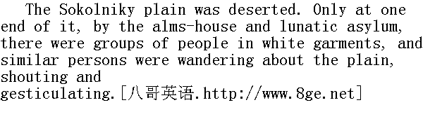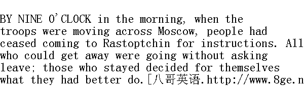 索科尔尼茨田野一片荒凉。只是在它的尽头, 在养老院和疯人院旁边, 见到一堆堆穿白衣衫的人, 其中有几人单个地在田野上走着, 一边吼叫, 一边挥动胳膊。 One of them was running right across in front of Count Rastoptchin's carriage. And Count Rastoptchin himself and his coachman, and the dragoons, all gazed with a vague feeling of horror and curiosity at these released lunatics, and especially at the one who was running towards them.Tottering on his long, thin legs in his fluttering dressing-gown, this madman ran at headlong speed, with his eyes fixed on Rastoptchin, shouting something to him in a husky voice, and making signs to him to stop. The gloomy and triumphant face of the madman was thin and yellow, with irregular tufts of beard growing on it. The black, agate-like pupils of his eyes moved restlessly, showing the saffron-yellow whites above. "Stay! stop, I tell you!" he shouted shrilly, and again breathlessly fell to shouting something with emphatic gestures and intonations. 这几人中的一个跑着横穿过拉斯托普钦伯爵马车行驶的路。伯爵本人, 以及车夫和龙骑兵们, 都略带惊恐和好奇地看着这些放出来的疯子, 尤其是那个跑到他们跟前来的人。这人摇晃着细长的瘦腿, 长衫飘动着, 拼命追着马车跑, 两眼紧盯拉斯托普钦, 用嘶哑的嗓子对他喊, 并比划着要他停车。疯子的胡须浓密而又参差不齐, 忧郁而严肃的面孔又瘦又黄。黑色的玛瑙般的瞳仁在黄而发红的眼白里低垂地、惊慌地转动着。"停!别动!我说!"他尖叫着, 又用威严的音调和姿势, 喘息着喊些什么。 He reached the carriage and ran alongside it. 他赶上马车, 与它并排跑着。 "Three times they slew me, three times I rose again from the dead. They stoned me, they crucified me ... I shall rise again ... I shall rise again ... I shall rise again. My body they tore to pieces. The kingdom of heaven will be overthrown ... Three times I will overthrow it, and three times I will set it up again," he screamed, his voice growing shriller and shriller. Count Rastoptchin suddenly turned white, as he had turned white when the crowd fell upon Vereshtchagin. He turned away. "G ... go on, faster!" he cried in a trembling voice to his coachman." 他们杀死我三次, 我三次从死尸复活。他们用石头打我, 把我钉上十字架......我将复活......将复活......复活。他们撕碎了我的身躯。天国要毁灭......我摧毁它三次, 重建它三次, "他嚷叫着, 嗓门愈来愈高。拉斯托普钦伯爵脸色突然苍白, 就像人群扑向韦列夏金时他的脸色发白一样。他转过头去。"走......走快点!"他用颤抖的声音对车夫喊道。 The carriage dashed on at the horses' topmost speed. But for a long while yet Count Rastoptchin heard behind him the frantic, desperate scream getting further away, while before his eyes he saw nothing but the wondering, frightened, bleeding face of the traitor in the fur-lined coat. Fresh as that image was, Rastoptchin felt now that it was deeply for ever imprinted on his heart. He felt clearly now that the bloody print of that memory would never leave him, that the further he went the more cruelly, the more vindictively, would that fearful memory rankle in his heart to the end of his life. He seemed to be hearing now the sound of his own words: "Tear him to pieces, you shall answer for it to me!- Why did I say these words? I said it somehow without meaning to ... I might not have said them," he thought, "and then nothing would have happened." He saw the terror-stricken, and then suddenly frenzied face of the dragoon who had struck the first blow, and the glance of silent, timid reproach cast on him by that lad in the fox-lined coat. "But I didn't do it on my own account. I was bound to act in that way. La plebe ... le tra?tre ... le bien publique, ..." he mused. 马车全速飞驰;但伯爵很久都还听到身后渐远渐弱的疯子的绝望的呼喊, 而眼前则见到那个身穿狐皮大衣的惊惶的满是血迹的叛徒的脸。这一切都还记忆犹新, 拉斯托普钦现在感到它已深入自己血液嵌入内心了。他现在清楚地意识到, 这记忆中的血痕将永不消失, 并且相反, 时间愈久, 这一可怕的记忆在他心上会愈加折磨他, 愈加令他难受。他现在似乎听到自己说话的声音: "砍死他, 你们砍下头来回报我!""为什么我说这句话!大概是偶然说的......我本来可以不说(他想), 那就什么事都不会有了。"他看到那个砍人的士兵的恐惧而又突然变得凶狠的面孔, 看见那个穿狐皮大衣的年轻人向他投射过来的胆怯的无言的责备的目光......"但我不是为自己这样作的。我必须这样作。La plebe, le traitre ......le bien publique."①他想。 The bridge over the Yauza was still crowded with troops. It was hot. Kutuzov, looking careworn and weary, was sitting on a bench near the bridge, and playing with a whip on the sand, when a carriage rattled noisily up to him. A man in the uniform of a general, wearing a hat with plumes, came up to Kutuzov. He began addressing him in French, his eyes shifting uneasily, with a look between anger and terror in them. It was Count Rastoptchin. He told Kutuzov that he had come here, for since Moscow was no more, the army was all that was left. "It might have been very different if your highness had not told me you would not abandon Moscow without a battle; all this would not have been!" said he. 雅乌兹桥头, 军队仍十分拥挤。天气很热。阴沉忧郁的库图佐夫坐在桥边一条凳子上, 用鞭子玩弄沙土, 这时有一辆马车隆隆向他驶来。一位身穿将军服, 戴羽饰帽, 不知他是愤怒, 还是恐惧, 眼睛珠子不停地乱转, 他走到库图佐夫身旁, 用法语向他讲起话来。这就是拉斯托普钦伯爵。他向库图佐夫说, 莫