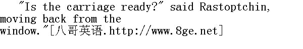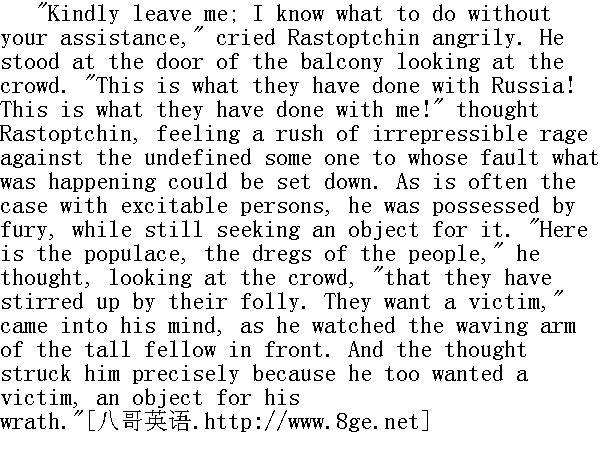 请便吧, 没有您我也知道怎么办, "拉斯托普钦生气地大声说。他在阳台门边往下看着人群。"他们把俄国搞成这样!他们把我也搞成这样!"拉斯托普钦想, 感到心里头升起一股不可遏制的怒火, 要向这笔账该记在他头上的某个人发泄。像肝火旺的人常有的情形, 愤怒控制了他, 但还没找到发泄对象。"La voila la populace, la lie du peuple, "他望着人群心里想道, "la plebe qu'ils ont soulevee par leur sottise.Il leur faut une victime."①出现在他思绪里, 这时, 他看到了高个小伙子挥动手臂。他之所以有这个想法, 正是因为他本人就需要这件牺牲品, 这个供他发泄愤怒的对象。 ①这一群贱民, 老百姓的败类。平民, 他们的愚蠢把这些败类和贱民鼓动起来了, 他们需要一个牺牲品。 "Is the carriage ready?" he asked again." 马车准备好了吗?"他又问了一次。 "Yes, your excellency. What orders in regard to Vereshtchagin? He is waiting at the steps," answered the adjutant." 好了, 爵爷。您下令如何处置韦列夏金?他已被带来, 在门廊旁等着。"副官说。 "Ah!" cried Rastoptchin, as though struck by some sudden recollection." 噢!"拉斯托普钦大叫了一声, 仿佛被意外想起的一件事震惊了。