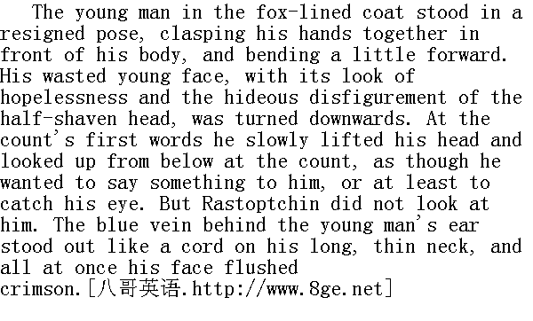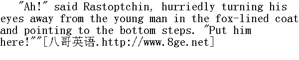 于是, 他迅速拉开门, 迈着坚定的步子走上阳台。说话声突然静止, 礼帽和便帽都从头上脱下, 所有的眼睛都抬起来望着走出来的伯爵。 "Good-day, lads!" said the count, speaking loudly and quickly. "Thanks for coming. I'll come out to you in a moment, but we have first to deal with a criminal. We have to punish the wretch by whose doing Moscow is ruined. Wait for me!" And as rapidly he returned to the apartment, slamming the door violently." 你们好, 弟兄们!"伯爵讲得又快又响亮, "谢谢你们到来。我马上下来看你们, 但我们得先处置一个坏人。我们必须惩办一个使莫斯科毁掉了的坏人。请等着我!"伯爵同样快步地返回室内, 砰地一声关上了门。 An approving murmur of satisfaction ran through the crowd. "He'll have all the traitors cut down, of course. And you talk of the French ... he'll show us the rights and the wrongs of it all!" said the people, as it were reproaching one another for lack of faith. 人群里传遍了满意和赞许的低语声。"这么说, 他要惩治所有的坏家伙了!而你说, 只是一个法国人......他就会把全部情况给你推开的!"人们说着, 仿佛彼此责备对方不相信自己似的。 A few minutes later an officer came hurriedly out of the main entrance, and gave some order, and the dragoons drew themselves up stiffly. The crowd moved greedily up from the balcony to the front steps. Coming out there with hasty and angry steps, Rastoptchin looked about him hurriedly, as though seeking some one. 几分钟后, 从正门匆匆走出一位军官, 说了句什么命令, 于是龙骑兵排成长列。人群离开阳台急切地涌向门廊。拉斯托普钦愤怒地快步走上门廊, 急忙扫视周围, 似乎在寻找谁。 "Where is he?" he said, and at the moment he said it, he caught sight of a young man with a long, thin neck, and half of his head shaven and covered with short hair, coming round the corner of the house between two dragoons. This young man was clothed in a fox-lined blue cloth coat, that had once been foppish but was now shabby, and in filthy convict's trousers of fustian, thrust into uncleaned and battered thin boots. His uncertain gait was clogged by the heavy manacles hanging about his thin, weak legs." 他在哪儿?"伯爵问道, 就在他刚一说完这句话的同时, 他看到两个龙骑兵夹着一个年轻人从屋角走了出来, 这人脖子细长, 剃掉半边的头又长出了短发。他身穿一件颇为漂亮的, 现已破旧的蓝呢面狐皮大衣, 肮脏的麻布囚裤, 裤脚塞在未经擦拭且已变形的瘦小的靴子里。细瘦而无力的腿上套着脚镣, 使步履蹒跚的年轻人行动更加吃力。