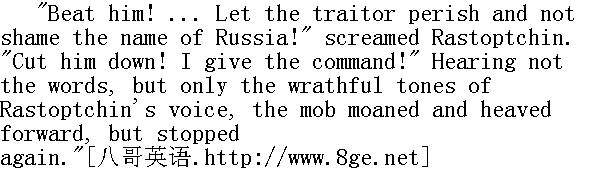 打他!......让这个叛徒完蛋, 不许他有损俄国人的名声!"拉斯托普钦喊着。"用刀砍!我命令!"没听清楚讲话, 却听清伯爵愤怒声音的人群, 骚动起来, 并往前挤, 随后又停了下来。 "Count!" ... the timid and yet theatrical voice of Vereshtchagin broke in upon the momentary stillness that followed. "Count, one God is above us ..." said Vereshtchagin, lifting his head, and again the thick vein swelled on his thin neck and the colour swiftly came and faded again from his face. He did not finish what he was trying to say." 伯爵!......"在又一次出现的短暂的寂静中, 响起了韦列夏金胆怯而又铿锵的说话声。"伯爵, 我们的头上, 有一个上帝......"韦列夏金说, 他抬起了头, 细小的脖颈上那根粗血管又充血了, 鼓胀起来, 红潮很快泛上他的面庞, 又很快地消失。他没有把他要说的话说完。 "Cut him down! I command it! ..." cried Rastoptchin, suddenly turning as white as Vereshtchagin himself." 砍他的头!我命令......"拉斯托普钦吼叫之后, 突然脸色刷白, 像韦列夏金一样。 "Draw sabres!" shouted the officer to the dragoons, himself drawing his sabre." 刀出鞘!"军官向龙骑兵发出口令, 本人也拔出了军刀。 Another still more violent wave passed over the crowd, and reaching the front rows, pushed them forward, and threw them staggering right up to the steps. The tall young man, with a stony expression of face and his lifted arm rigid in the air, stood close beside Vereshtchagin. "Strike at him!" the officer said almost in a whisper to the dragoons; and one of the soldiers, his face suddenly convulsed by fury, struck Vereshtchagin on the head with the flat of his sword. 人群又一次地更为猛烈地涌动起来, 涌动的波浪到达前排后, 竟摇晃着涌上门廊的台阶。高个小伙子于是同韦列复金并排站在一起, 脸上的表情呆若石头, 举起的那只手也僵着不放下来。"砍!"军官对龙骑兵的说话声几乎是耳语, 于是, 一个士兵突然恶狠狠扭曲着脸, 举起一把钝马刀砍向韦列夏金的头部。